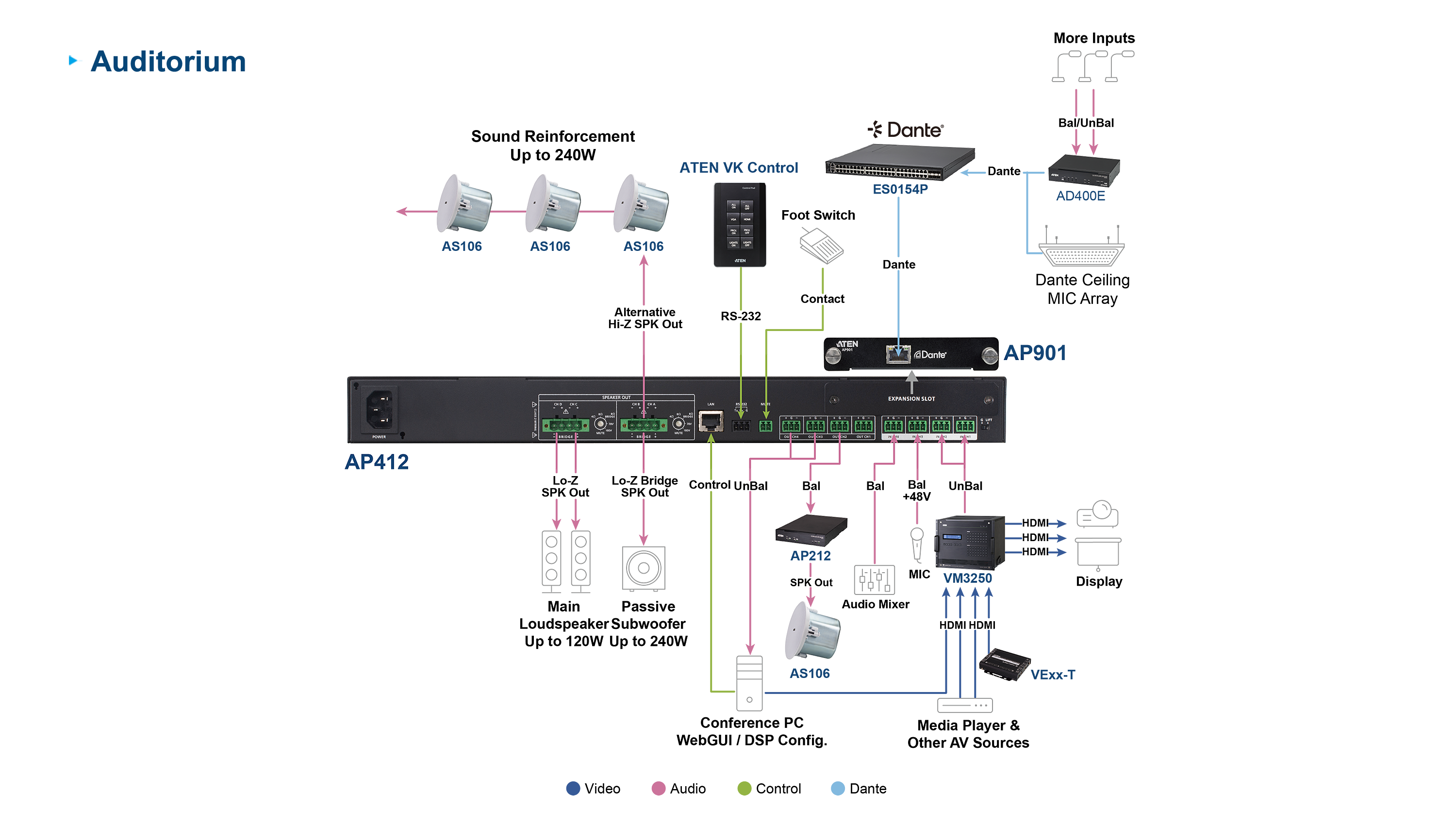 - Expansion slot for add-on expansion card – Install AP901 2-CH Dante Expansion Card to make the sound system compatible with Dante network or AP902 2-CH Mic/Line Pre-AMP Expansion Card to receive two more channels of mic / line input signals