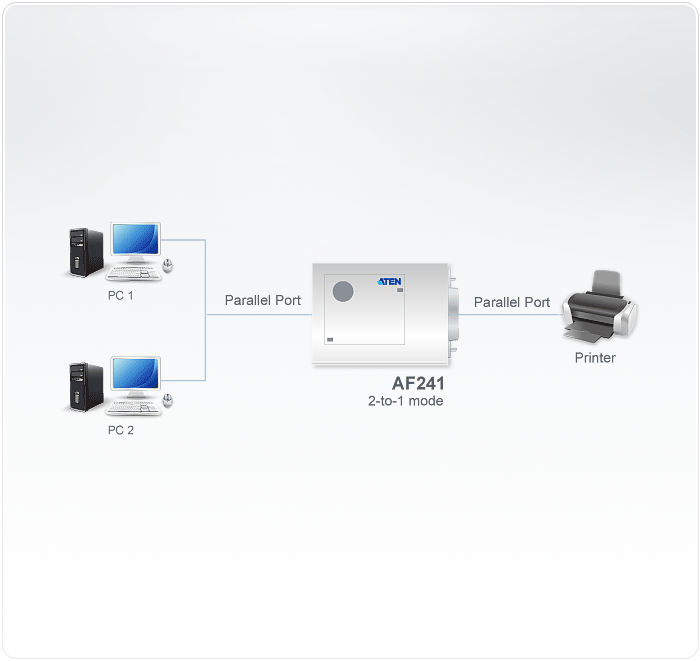 AF241 is a FIFO data switch using the 2 to 1 operation mode (i.e. 2 PCs to 1 printer) and allows users to transfer files to other PCs without additional cable connections.