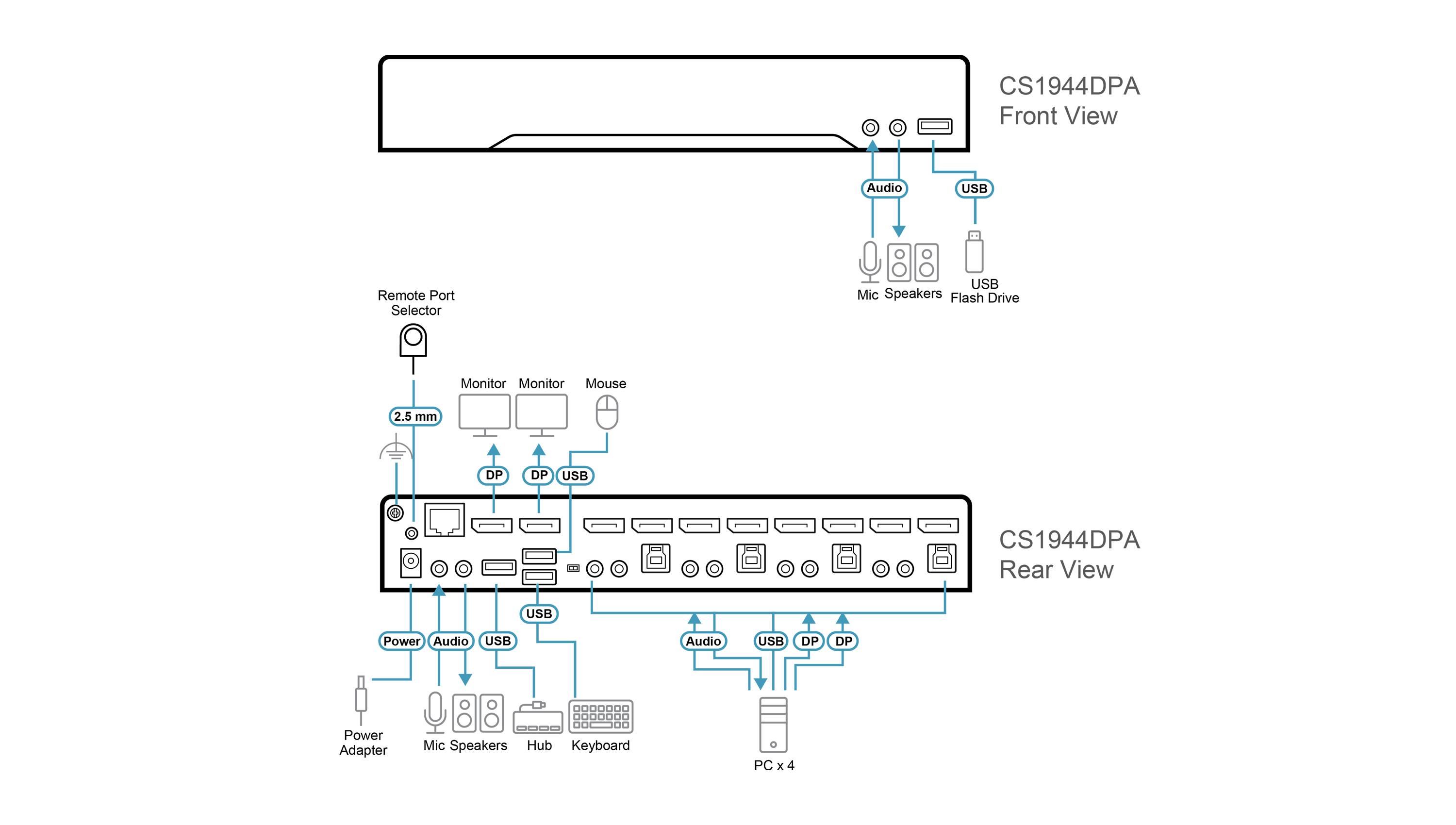 - Daisy-chainable quad-display control connecting two CS1944DPAs to manage up to four PCs and four displays with one keyboard and mouse
