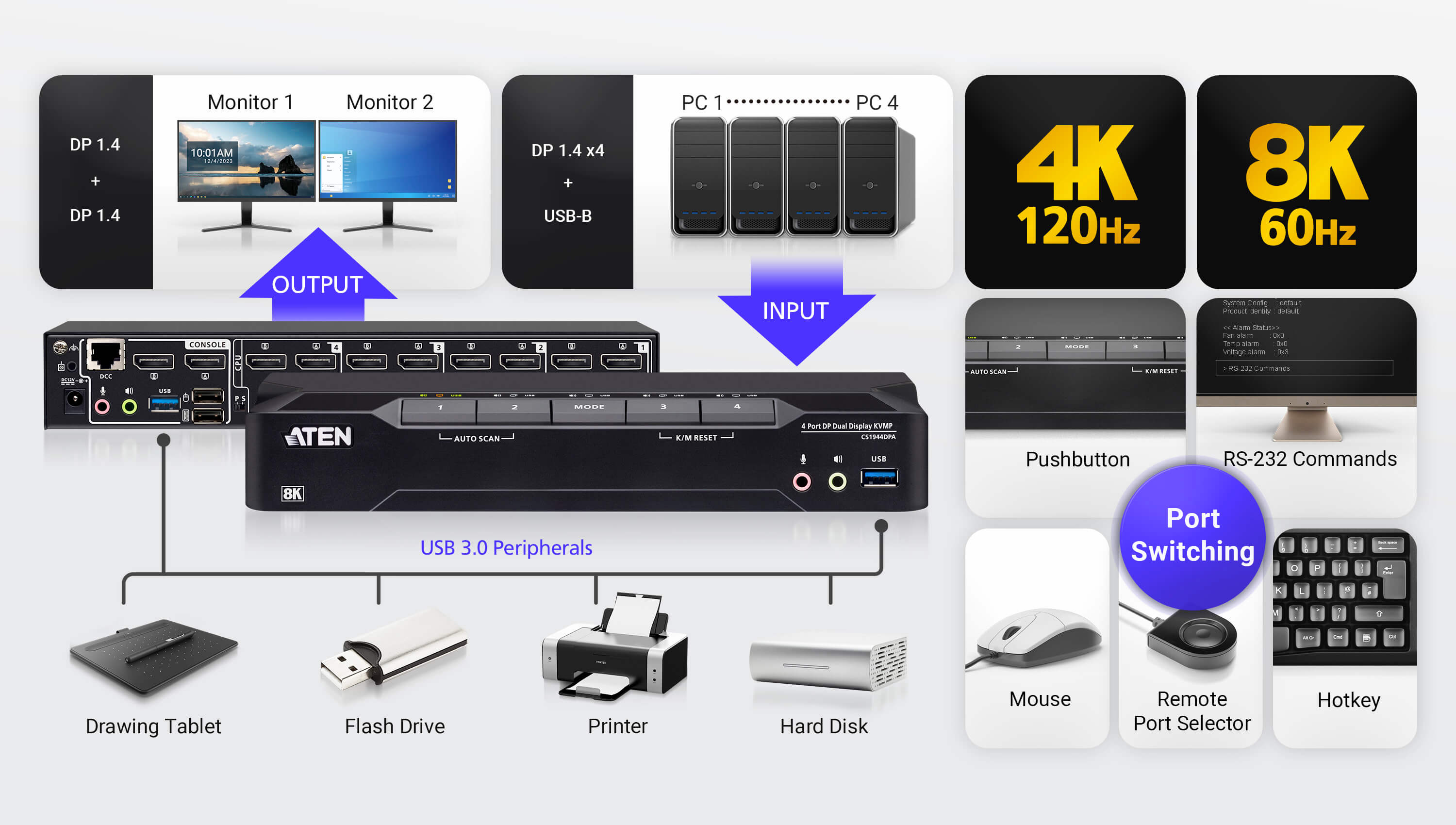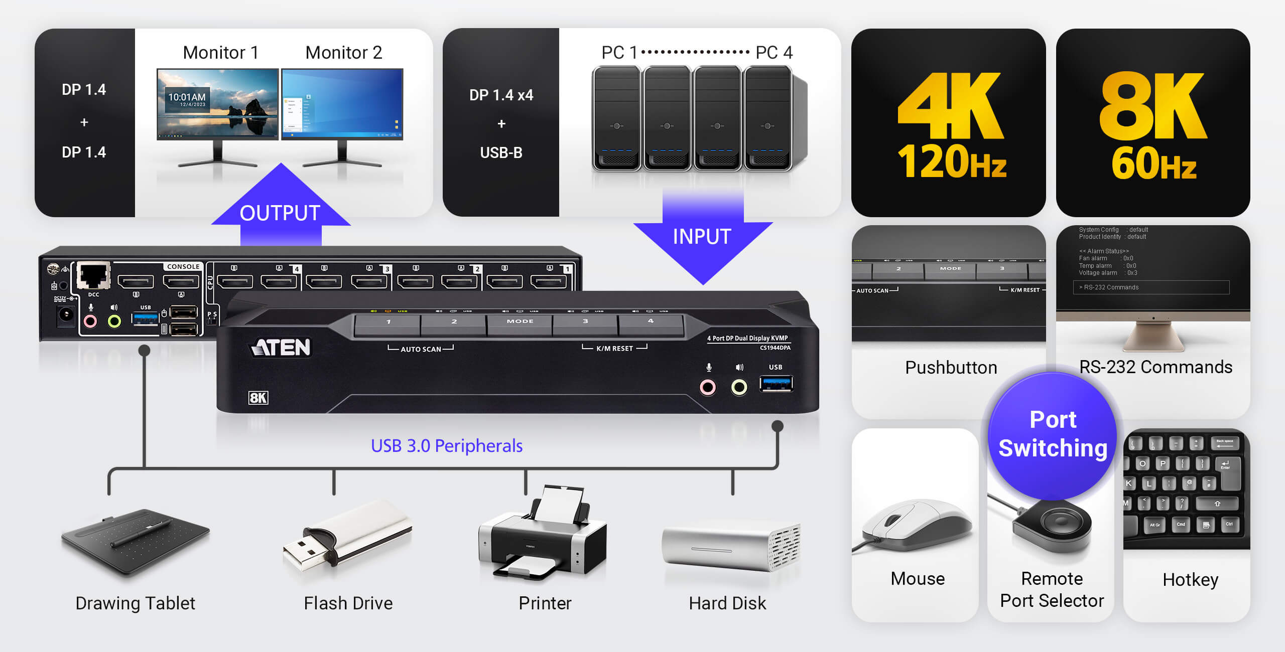- All DisplayPort/USB cables and power adapter included for hassle-free installation Computer selection via pushbuttons, remote port selector, hotkeys, mouse, and RS-232 commands