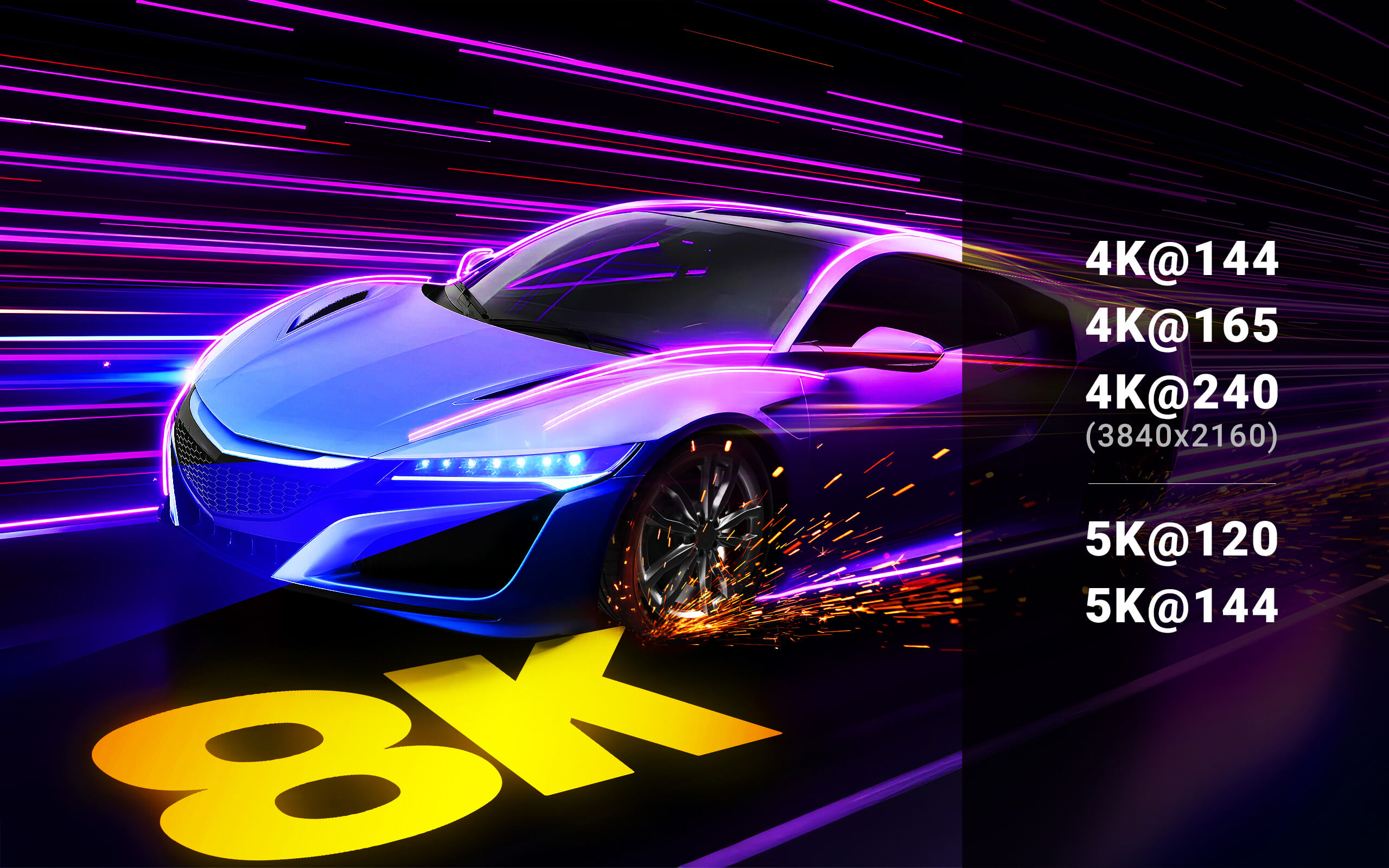 - Up to 7680 × 4320 @ 60 Hz, 5120 × 2880 @ 60 Hz and 4096 × 2160 @ 120 Hz