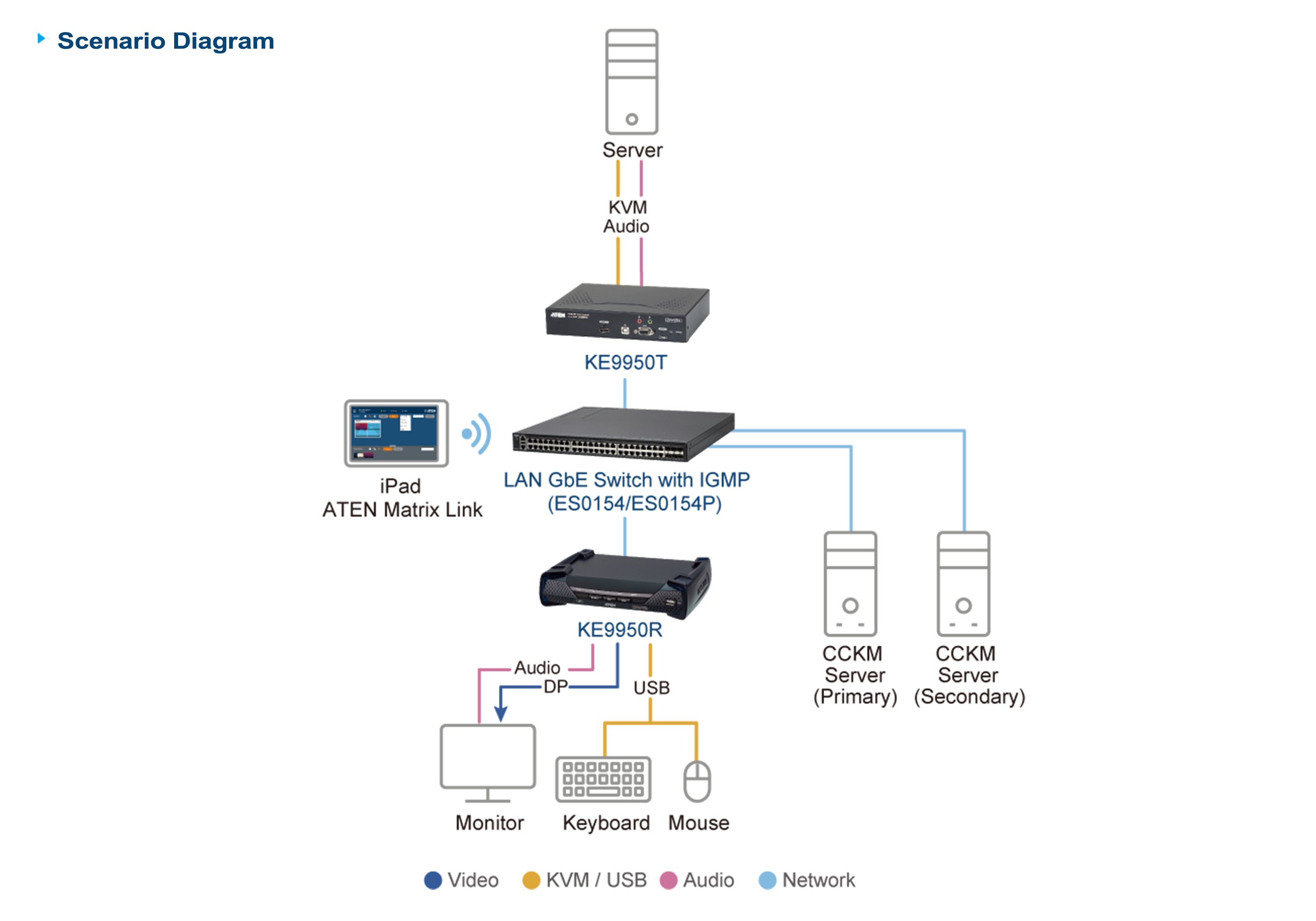 When integrated with the KVM over IP Matrix Manager (CCKM), the KE9950 supports more advanced features such as boundless switching, “Push” and “Pull”, video wall and multi-display setups, and profile scheduling that provide uninterrupted access with quick and easy control tools to use the KE9950 over a network.