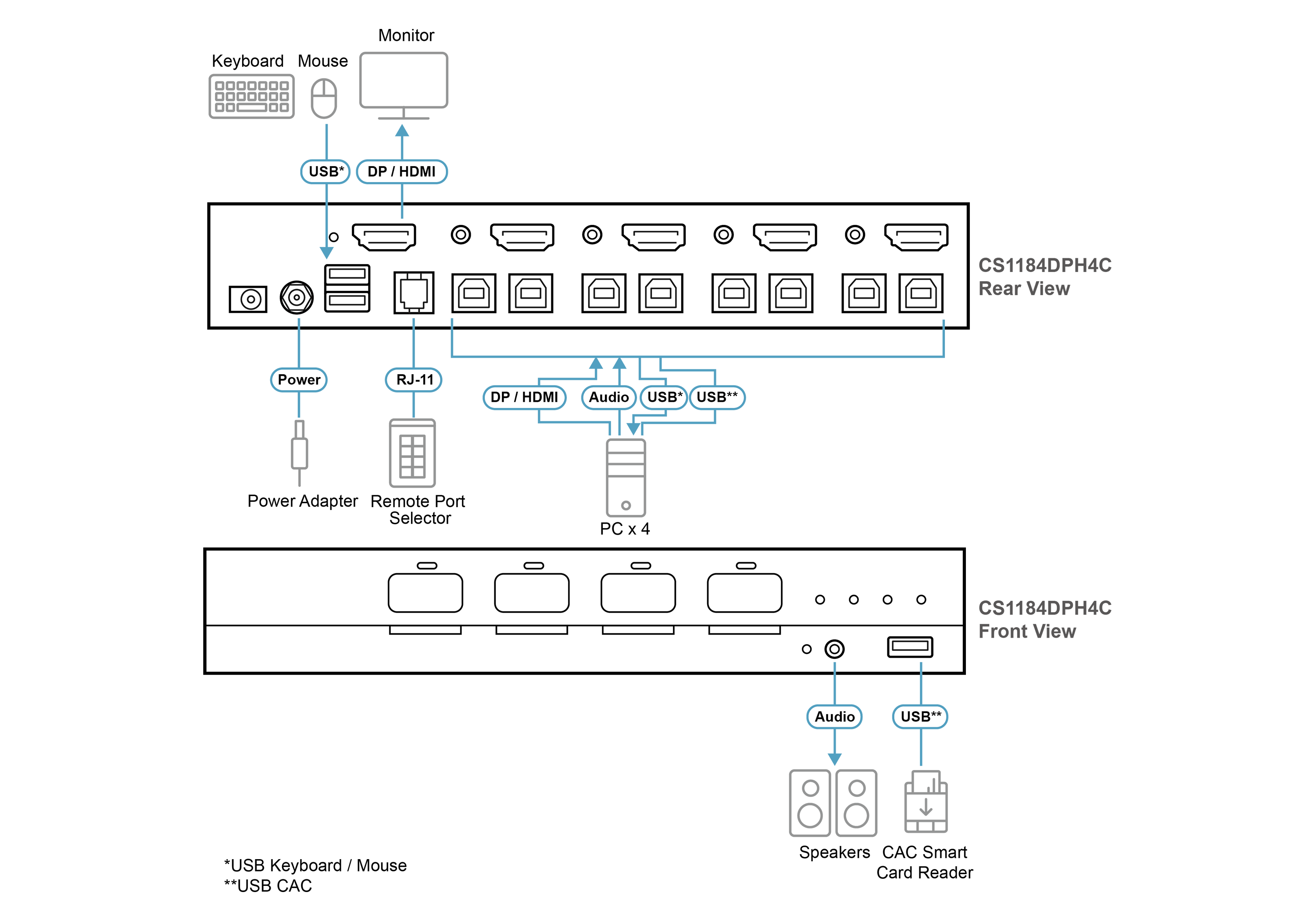 - 1x CS1184DPH4C 4-Port USB 5K DisplayPort/HDMI Universal Secure KVM Switch with CAC