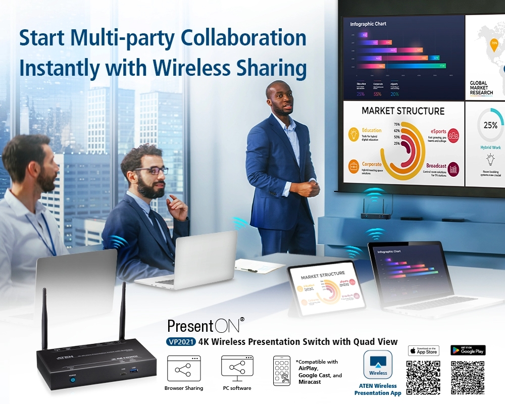 ATEN PresentON® VP2021 is a wireless BYOD solution that enables anyone, including visitors, to easily share content from a laptop or mobile device so that participants can actively collaborate for enhanced, efficient workflows.