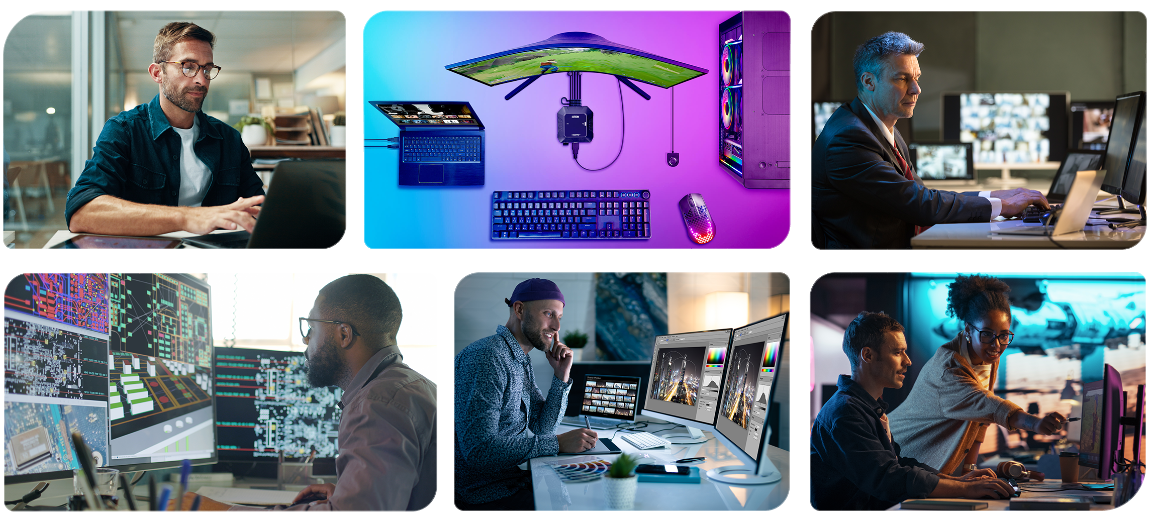 Designers, engineers, and gamers require ultra-high refresh rates, multi-8K displays, and the latest USB/Thunderbolt standards. ATEN supports up to 8K DisplayPort, 4K/240 Hz HDMI, and USB 3.2 Gen 2 for lag-free, next-gen performance.