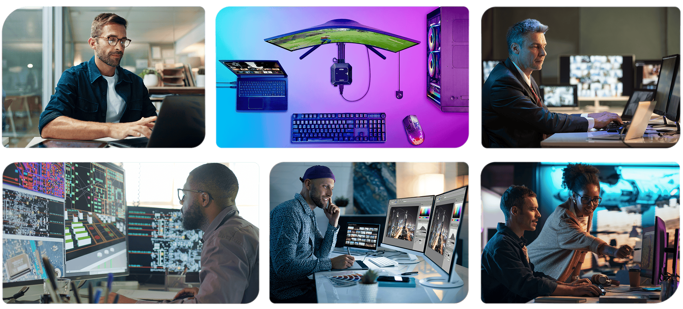 Designers, engineers, and gamers require ultra-high refresh rates, multi-8K displays, and the latest USB/Thunderbolt standards. ATEN supports up to 8K DisplayPort, 4K/240 Hz HDMI, and USB 3.2 Gen 2 for lag-free, next-gen performance.