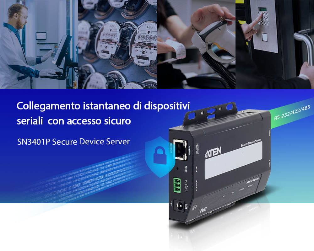 Una soluzione facile da usare, sicura e affidabile che facilita la connessione di un'ampia gamma di dispositivi seriali a una LAN Ethernet basata su IP in un istante. Il Secure Device Server SN3401P ATEN offre una connettività da seriale a Ethernet semplice e veloce, consentendo agli utenti di accedere in remoto a dispositivi seriali RS-232/422/485 da un PC situato ovunque. Grazie a diverse funzionalità affidabili, il modello SN3401P è ideale per le applicazioni di controllo dei processi commerciali e industriali.