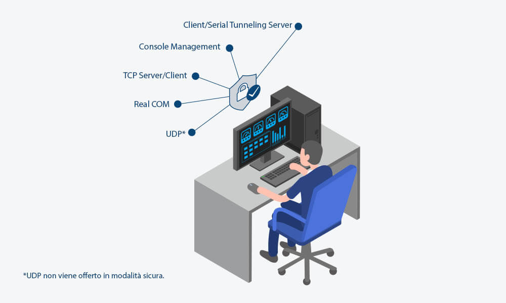 - Modalità operative protette – Secure Real COM, Secure TCP Server / Client, Secure Serial Tunneling Server / Client, Console Management (SSH) e Console Management Direct (SSH)