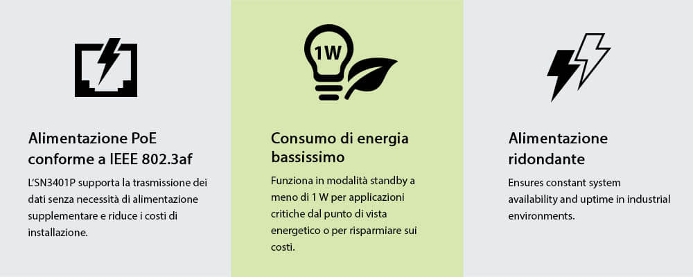 - Ingresso di alimentazione ridondante (jack di alimentazione e morsettiera) per un'alimentazione a prova di errore; apparecchiatura PoE PD (dispositivo alimentato) conforme a IEEE 802.3af