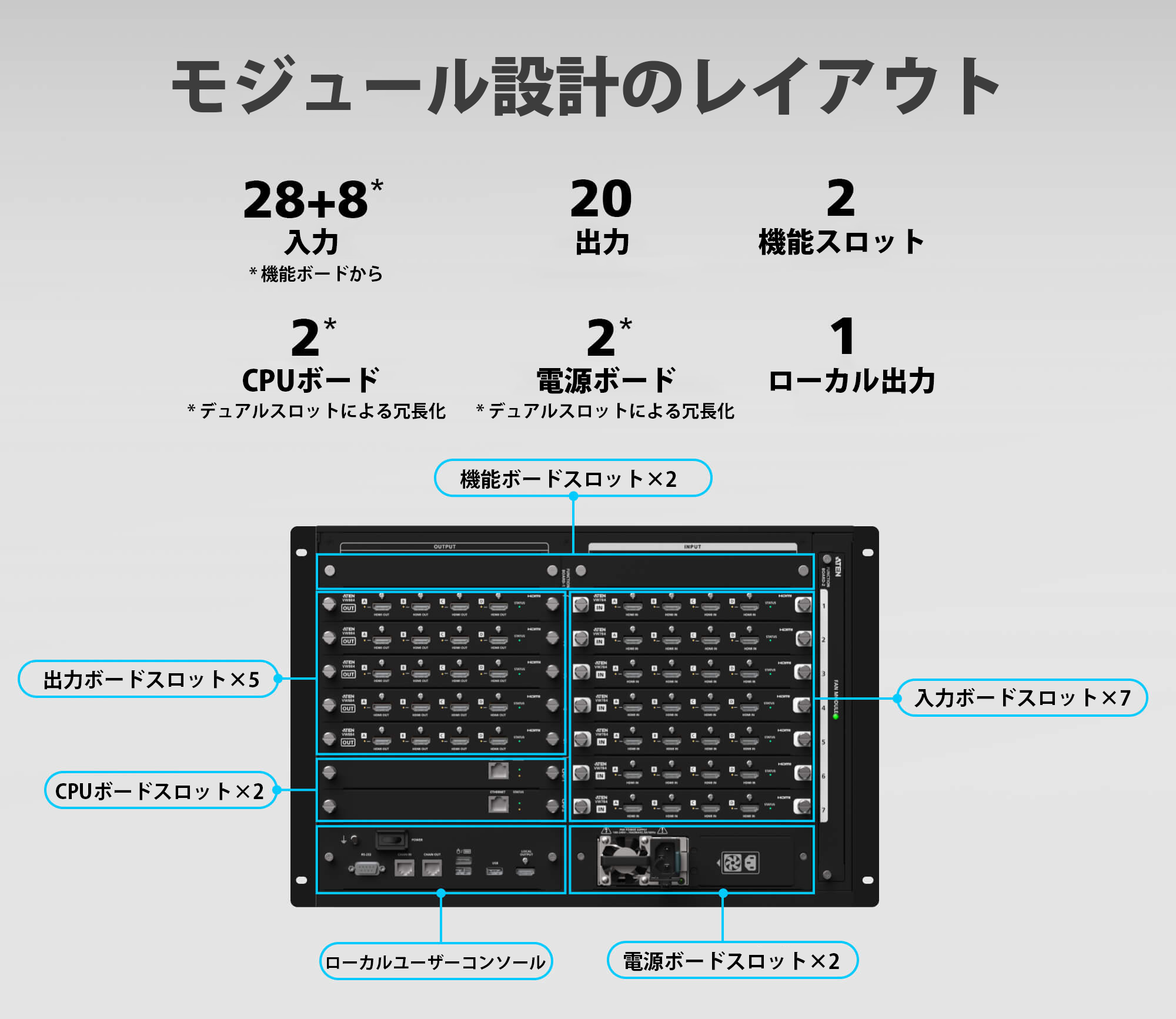- 単一の7Uシャーシから最大36の入力ソースを処理し、最大20のディスプレイを様々な解像度で管理