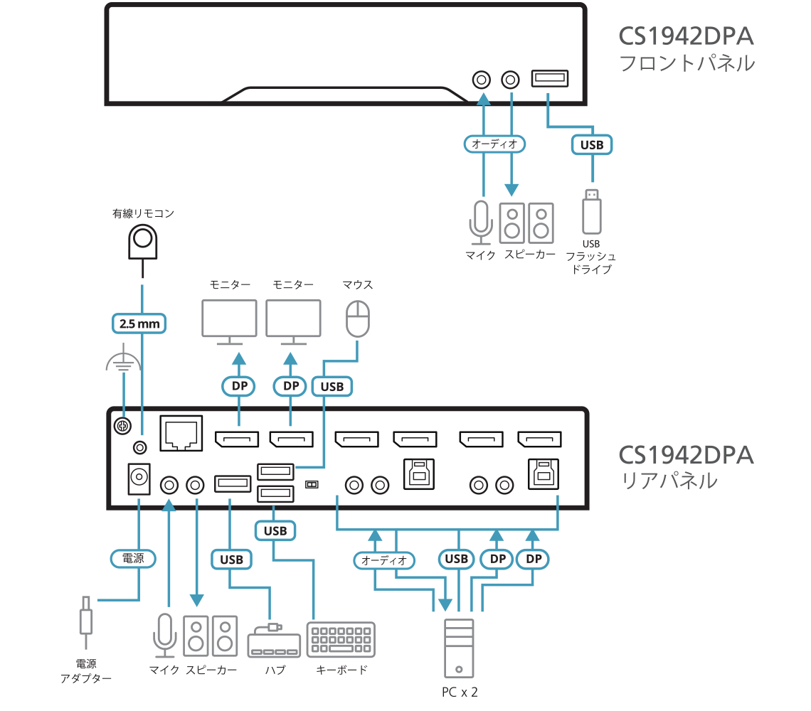 - USBキーボード1台とUSBマウス1台で、2台のDisplayPortコンピューターを切り替えて操作可能。USB周辺機器(最大2台)の共有にも対応