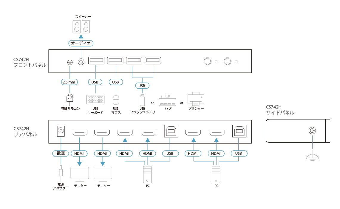 CS742Hは最大2台のPCを、キーボードとマウス各1台とHDMIディスプレイ2台を使って操作できるUSB HDMI KVMPスイッチです。