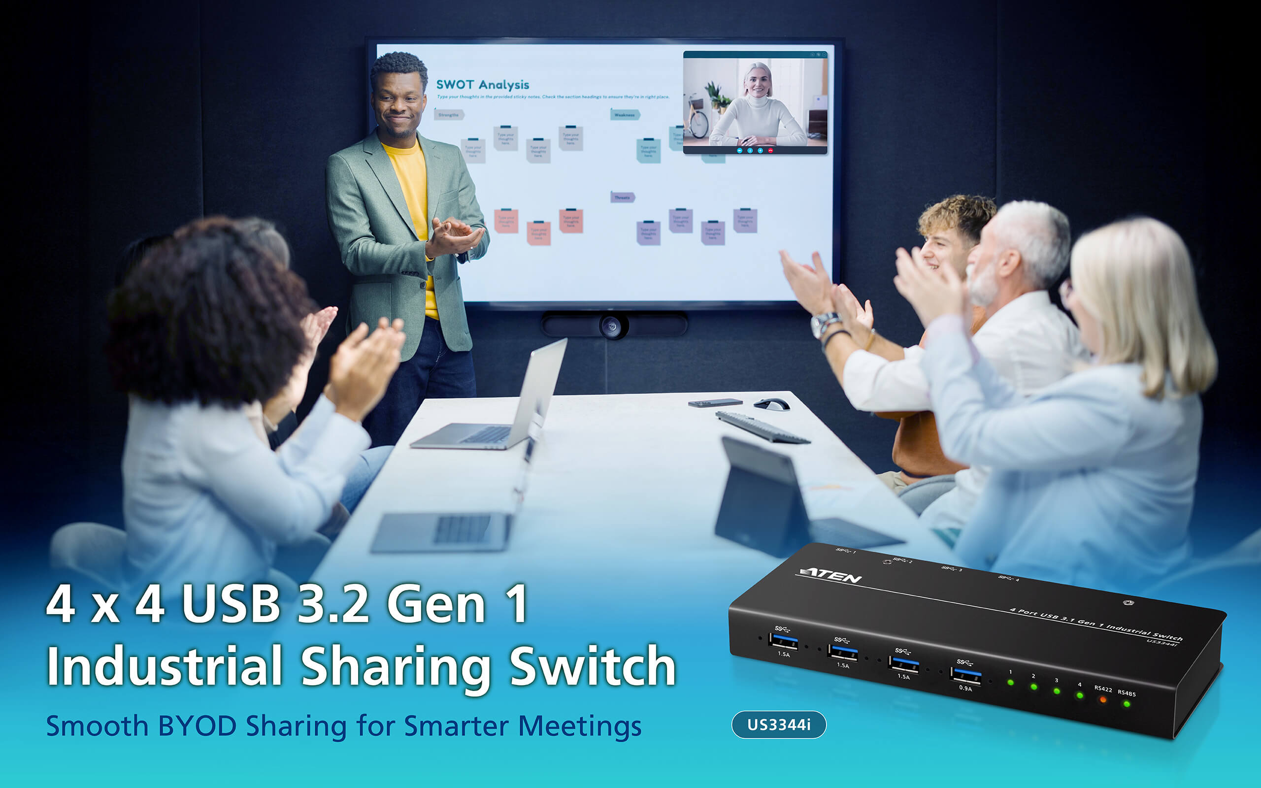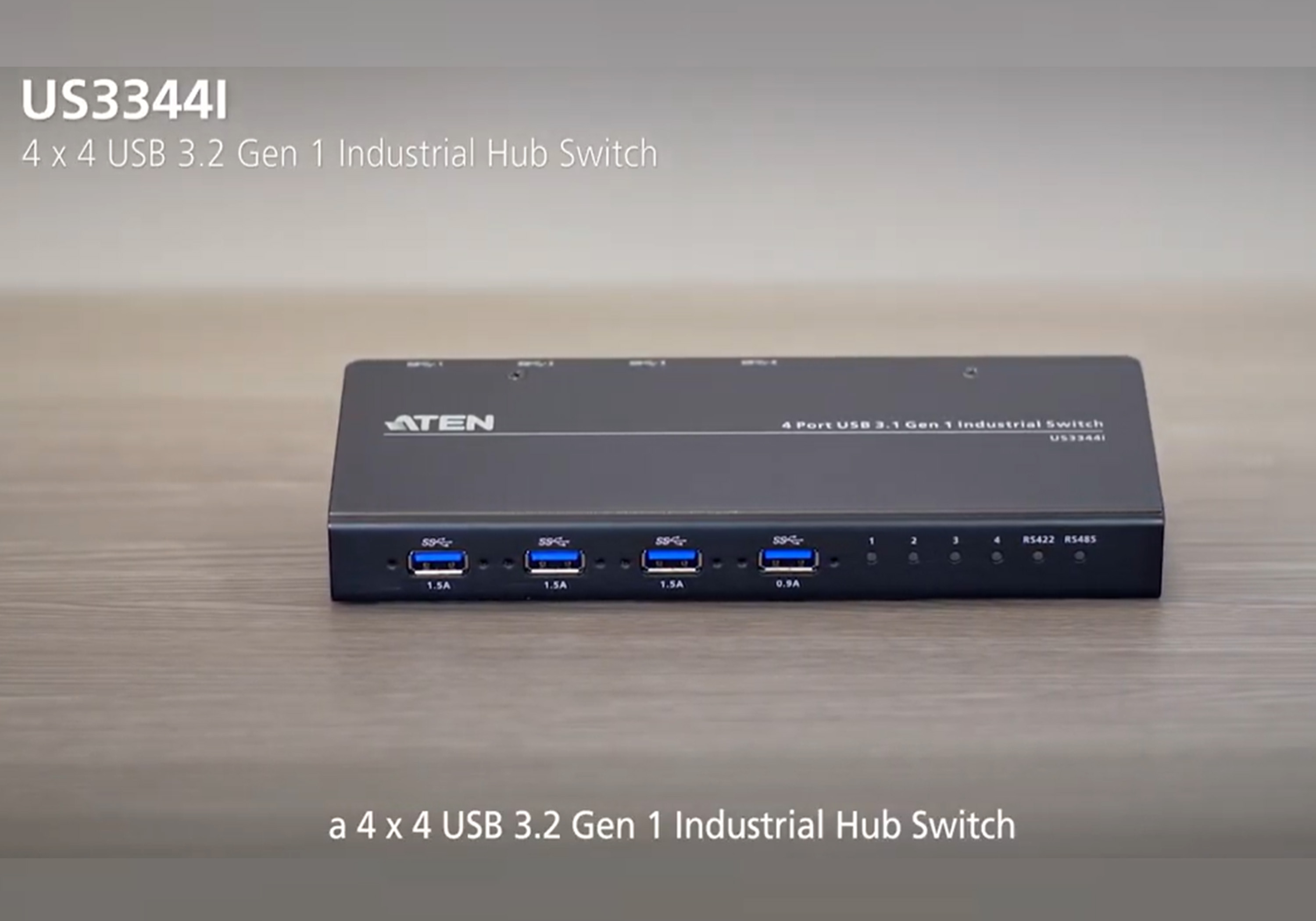 US3344Iは、キーボード・マウス・PC周辺機器などのUSB3.2 Gen1デバイス4台をコンピューター4台で切替ながら共有することができる4ポートUSB3.2 Gen1デバイス共有器です。どのコンピューターでUSBデバイスを使用するかは、リモコン、もしくはシリアルコマンドを使用して選択することができます。