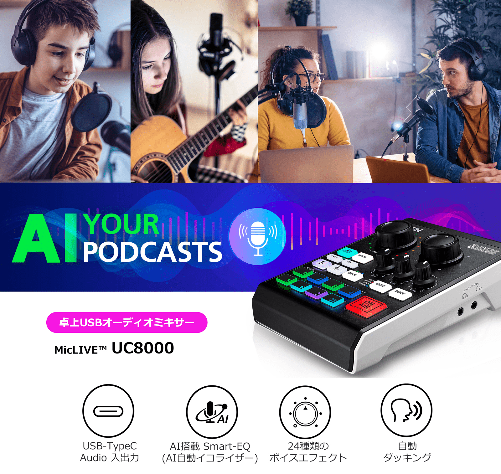 UC8000はポッドキャストやミュージックイベントのライブ配信に特化したAI搭載型オーディオミキサーです。コンパクトな本体には、ボイスエフェクト機能、SmartEQ、カスタマイズ可能なジングル・SEパッド、自動ダッキングといった機能を統合した「MicLIVE™」を使うことで、1人でも効果的で効率的なプロレベルの配信コンテンツを作成することができます。
