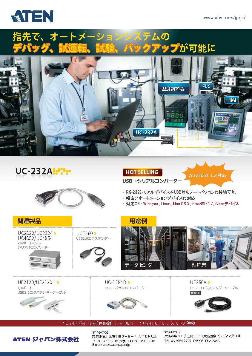 UC232AはRS-232コネクターを持つデバイスをノートパソコンやデスクトップコンピューターのUSBポートに接続できるようにするデバイスです。WindowsやMacに対応し、データ転送速度は最大921.6kbpsなので、特に産業用オートメーションシステムを始め、科学機器、POSシステムやその他専門的な工業/コンシューマー分野において、利便性の優れた製品となっています。
