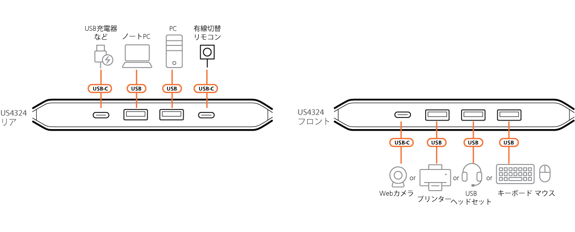 ※ US5324 / US4324:本体機能は同一で同梱ケーブルが異なります。US4324はUSB Type-Aケーブルを2本同梱しています。