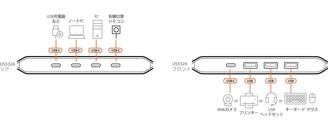 ※ US5324 / US4324:本体機能は同一で同梱ケーブルが異なります。 US5324はTypeA-AケーブルとTypeA-Cケーブル x各1本同梱しています。