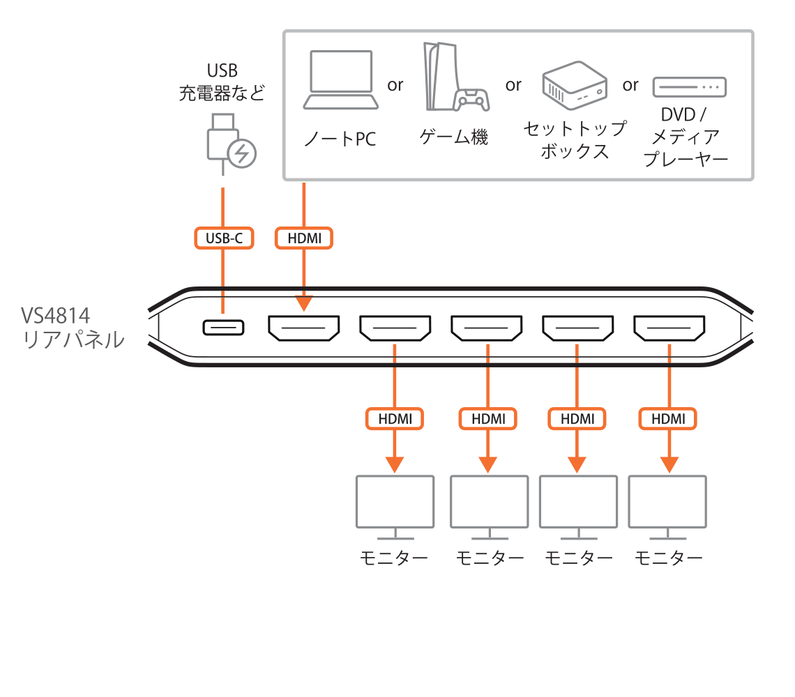 VS4814は、1台のHDMI機器の映像を4台のモニターに同時表示できる、4K60p対応のHDMI分配器です。