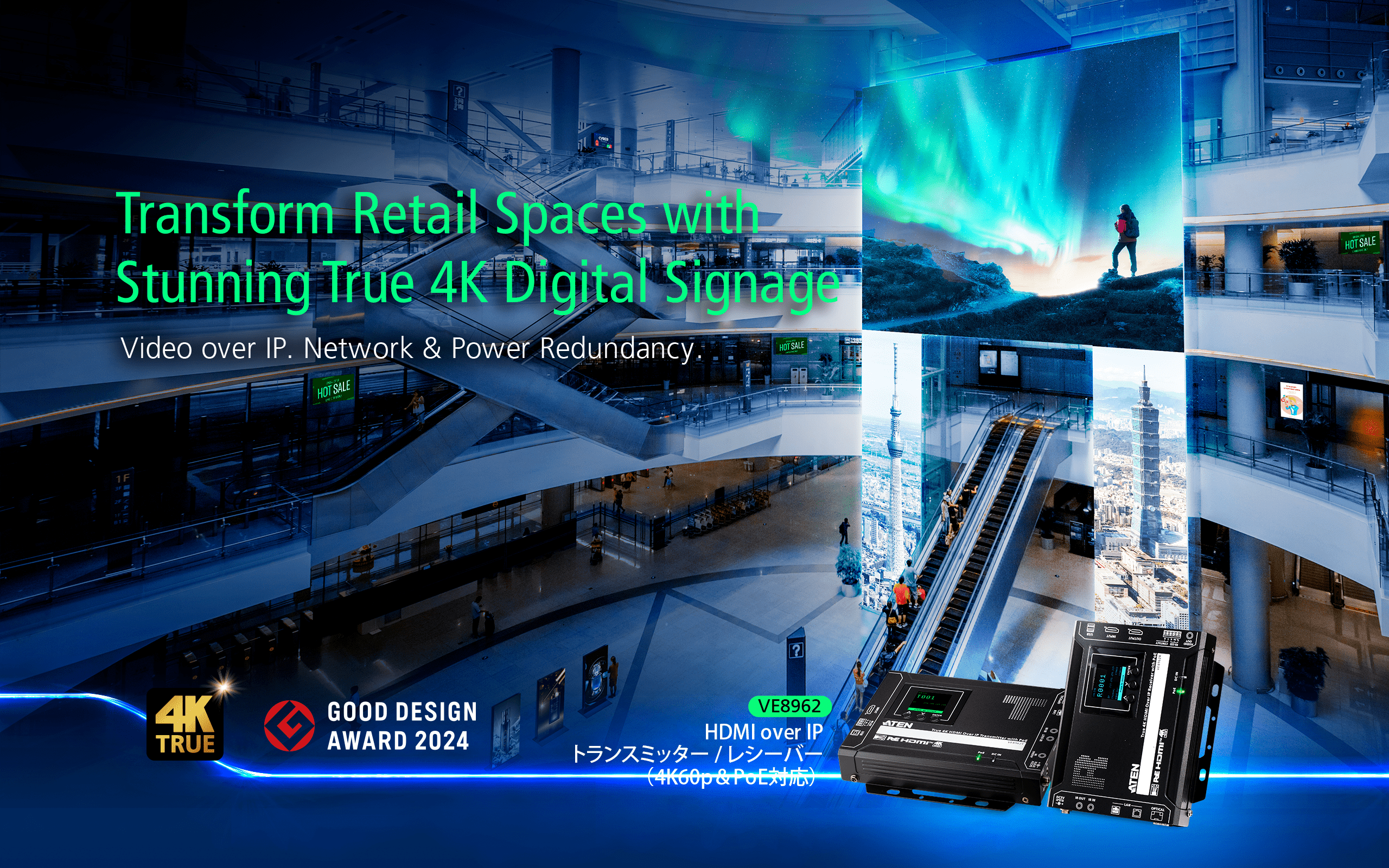 VE8962は、Ethernetと1Gbps光ファイバーの両方に対応したHDMI Video over IPビデオエクステンダーです。4K60p映像をCat5e/6ケーブル1本で最大100m、光ファイバー1本で最大10kmまで映像信号を延長でき、1フレーム未満の超低遅延を実現します。