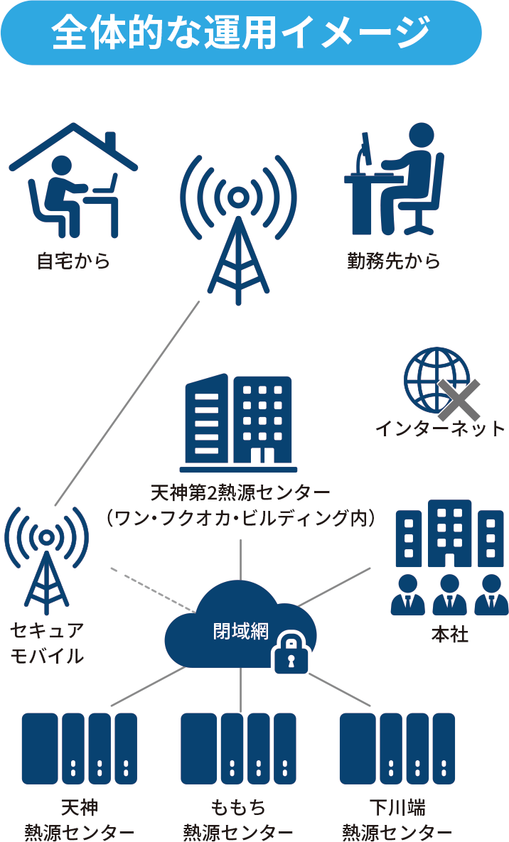 現在は、ワン・フクオカ・ビルディング内にある天神第2熱源センターを中央監視拠点とし、他の拠点を遠隔制御しています。拠点選定の理由は、新しい建物で設置が容易だったこと、夜間の出入りが比較的自由であること、さらに電源の信頼性が高いことです。天神第2熱源センターは九州電力のスポットネットワーク方式 を採用しており、3系統の電線で供給されるため、停電のリスクが低いのです。また耐震性に優れ、非常用発電機も備えており、災害時には避難所機能も果たせることが評価されました。