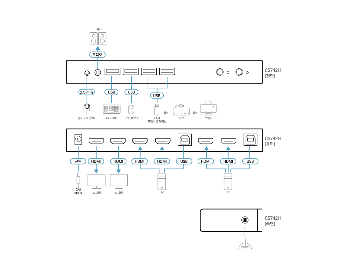 CS742H는 단일 키보드, 마우스, USB 주변기기를 통해 2대의 컴퓨터를 제어할 수 있어 데스크탑 공간을 절약하고 하드웨어 비용을 절감할 수 있습니다. 푸시 버튼, 원격 포트 선택기, 핫키, 마우스 휠과 같은 다양한 포트 전환 방식을 지원하여 여러 작업 환경에서 유연하고 편리하게 사용할 수 있습니다. 또한 USB 주변 기기 공유 기능이 있어 외장 드라이브, 웹캠, 프린터 등의 장치를 2대의 컴퓨터에서 원활하게 사용할 수 있습니다.