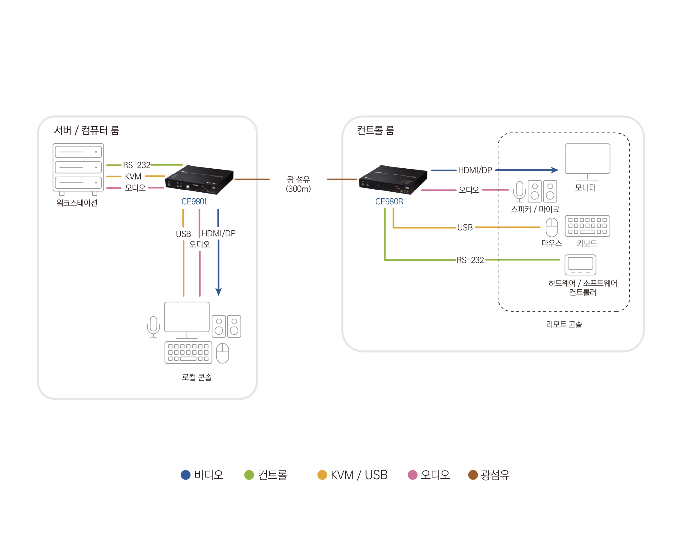 CE980은 광섬유 전송을 통해 KVM 신호를 최대 300m까지 연장하며 True 4K, HDCP 2.3 준수 비디오를 제공합니다. DisplayPort와 HDMI를 모두 지원하는 콤보 포트로 설치가 간편하고, 로컬 및 원격 콘솔 모두에서 영상 출력 선택이 가능합니다. 우수한 영상 품질 외에도 RS-232, USB 2.0 주변기기, 내장형 DisplayPort/HDMI 디지털 오디오(Dolby TrueHD, Dolby Digital Plus, DTS-HD Master Audio 등)를 지원하여 하나의 광 섬유 케이블만으로 다양한 신호 전송이 가능한 유연한 솔루션입니다. 의료, 포스트 프로덕션, 제조 등 정밀하고 안정성이 요구되는 제어 환경에 최적화되었습니다.