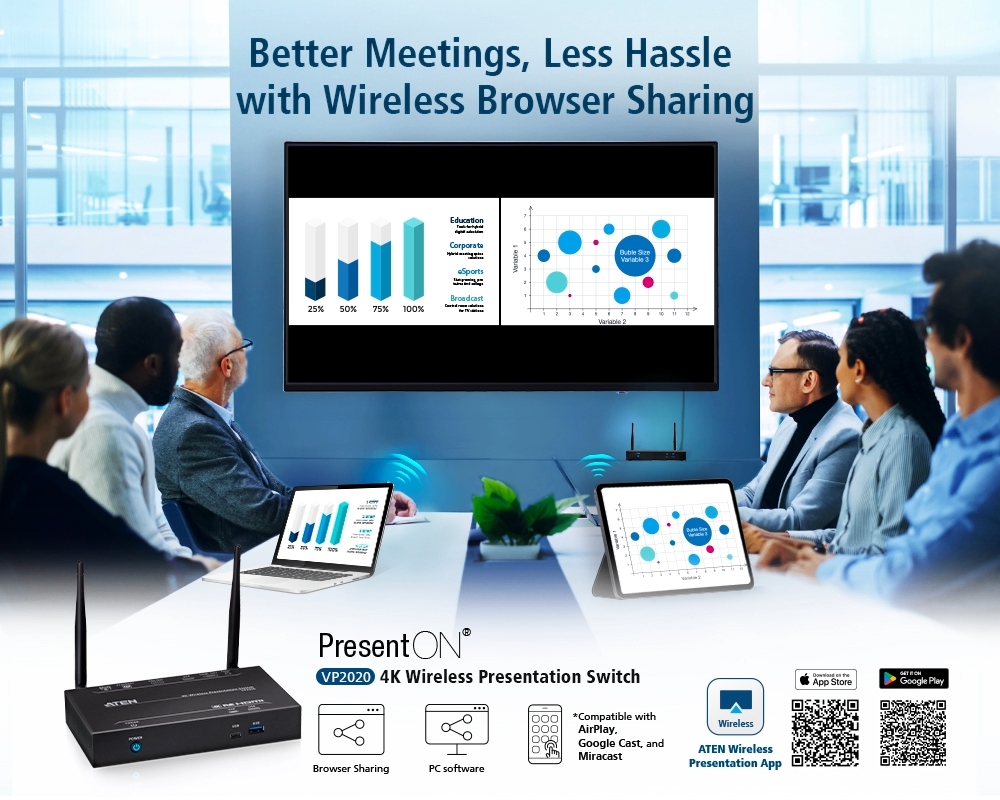 VP2020은 무선 BYOD 솔루션으로 와이파이 모듈과 성공적인 회의의 필수 요소인 다중 접속 접근 방식을 특징으로 하는 4K 프레젠테이션 스위치입니다. 노트북이나 모바일 기기에서 와이파이를 통해 최대 4K 콘텐츠를 HDMI 지원 디스플레이 1개와 VGA 지원 디스플레이 1개에 동시에 전송할 수 있다. 무선 연결은 전용 ATEN 무선 프레젠테이션 스위치 앱을 통해 Windows, macOS 등 주요 운영 플랫폼을 모두 지원합니다. 또한 AirPlay*, Google Cast*, Chrome과 호환됩니다.