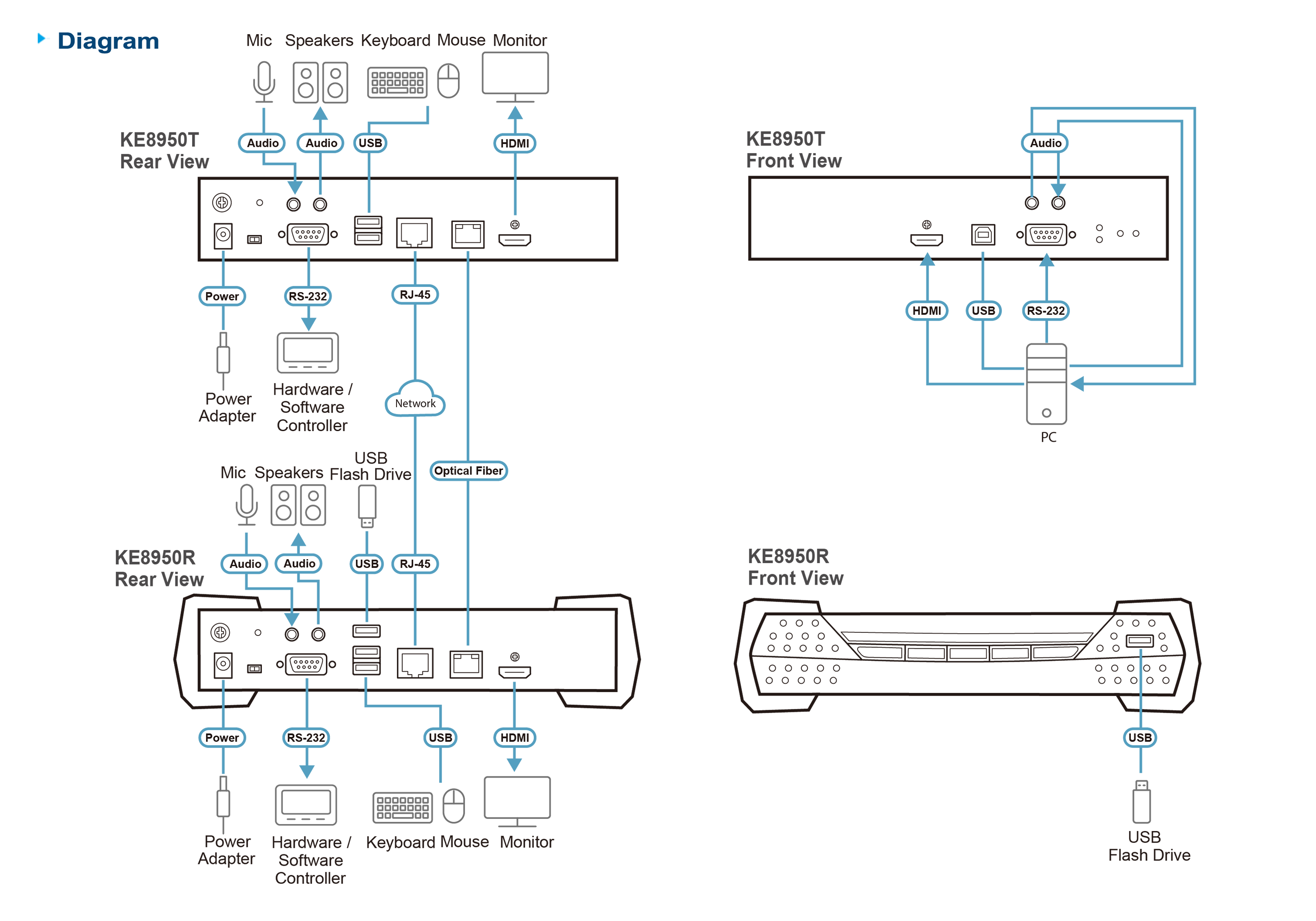 El Extensor de KVM HDMI 4K a través de IP está compuesto por una unidad de transmisión que se conecta al ordenador, y una unidad de recepción que permite acceder a la consola desde una ubicación remota. El acceso al ordenador se realiza desde la consola remota, a través de una red TCP/IP conectada mediante un cable Cat 5e/6 que permite administración de punto a punto, de punto a multipunto, de multipunto a punto y de multipunto a multipunto. El KE8950 se puede conectar a otro modelo igual de forma directa, mediante una red de alta velocidad, mediante una LAN de cobre o fibra.