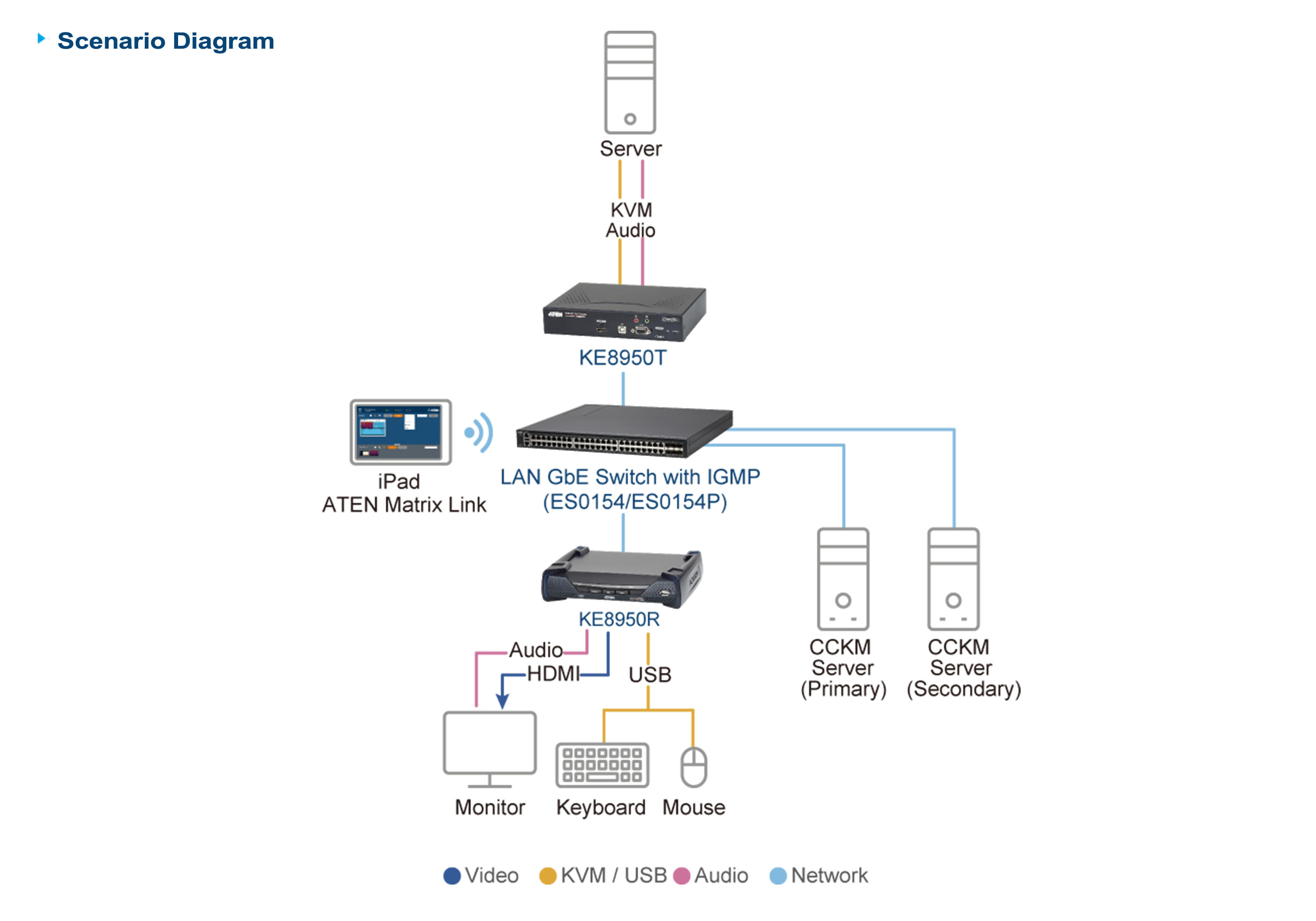 ATEN integra su experiencia en las soluciones KVM a través de IP en los modelos KE8950, extensores KVM HDMI basados en IP que permiten acceder a un sistema informático desde una consola USB remota desde cualquier punto de una intranet. Los extensores KVM a través de IP KE8950 admiten un monitor HDMI en cada extremo, y ofrecen una imagen de vídeo muy optimizada con resolución de vídeo 4K x 2K (hasta 3840 x 2160). El KE8950 también admite expansiones de módulo de fibra SFP a 1 Gbps, lo que permite conexiones mediante una red de fibra óptica para ampliar las distancias de transmisión.