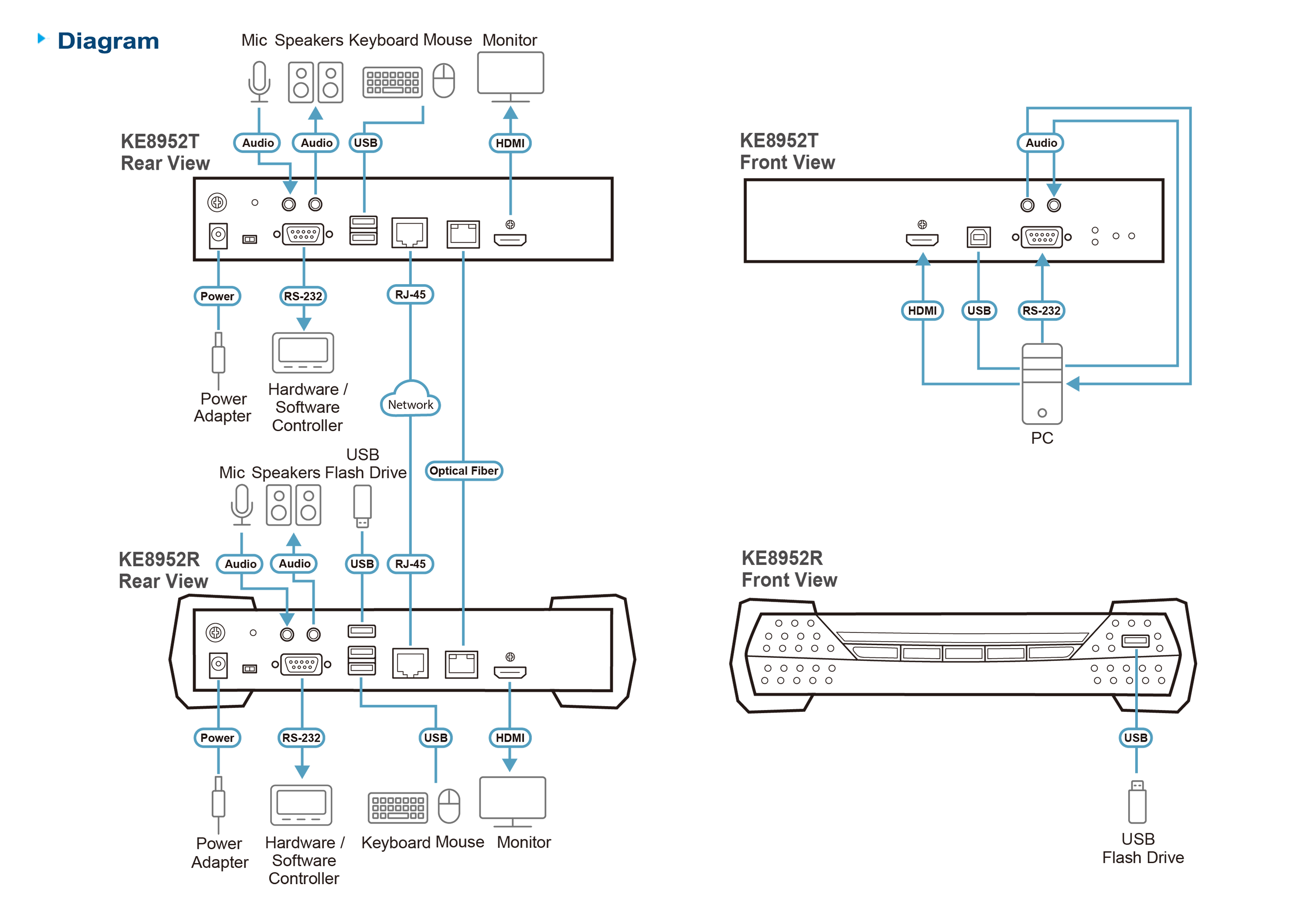El Extensor de KVM HDMI 4K a través de IP está compuesto por una unidad de transmisión que se conecta al ordenador, y una unidad de recepción que permite acceder a la consola desde una ubicación remota. El acceso al ordenador se realiza desde la consola remota, a través de una red TCP/IP conectada mediante un cable Cat 5e/6 que permite administración de punto a punto, de punto a multipunto, de multipunto a punto y de multipunto a multipunto. El KE8952 se puede conectar a otro modelo igual de forma directa, mediante una red de alta velocidad, mediante una LAN de cobre o fibra.