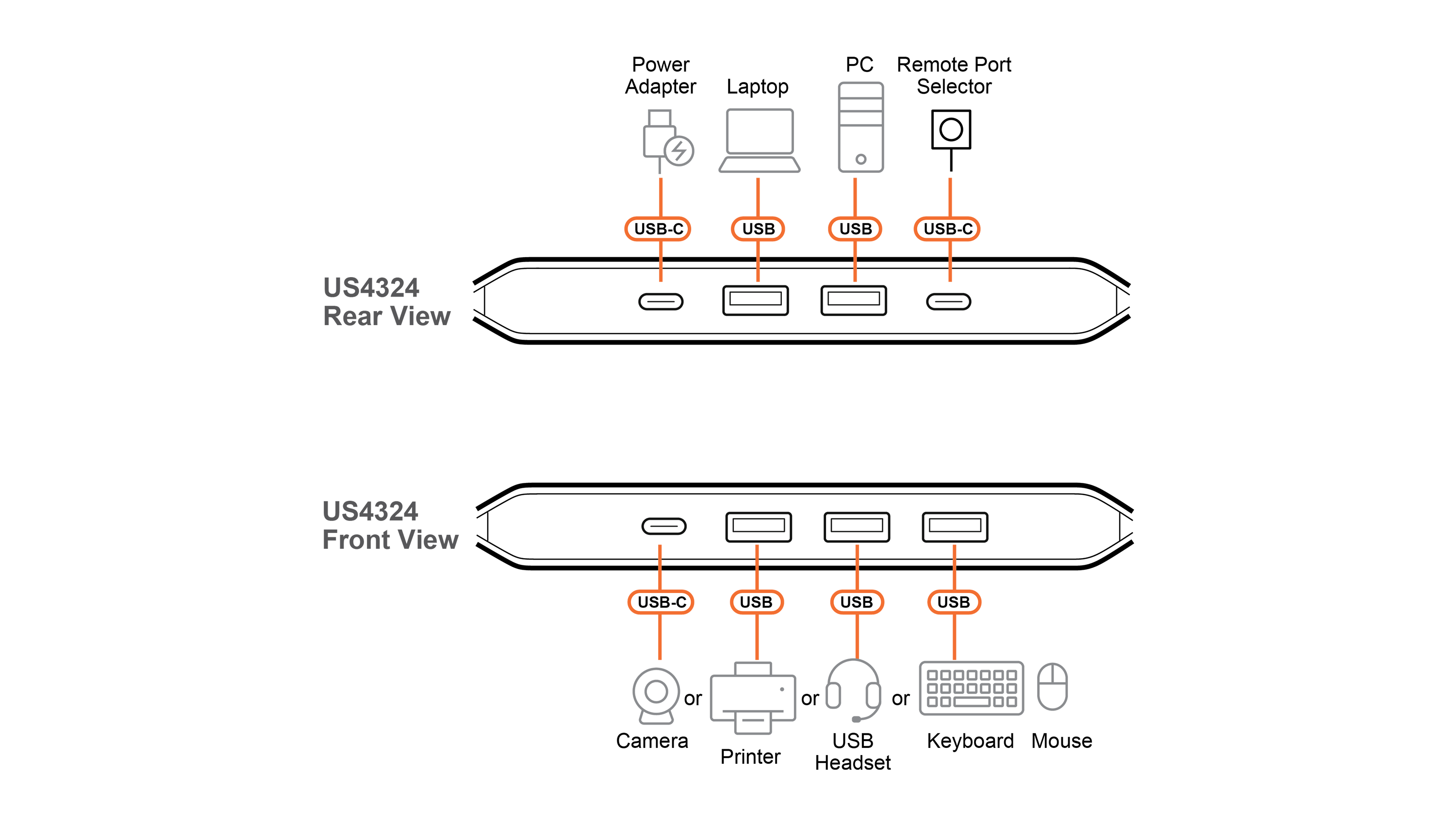 - Ciesz się wygodą przełączania urządzeń USB między dwoma systemami za pomocą jednego naciśnięcia przycisku na US4324 lub zdalnego selektora portów (w zestawie)