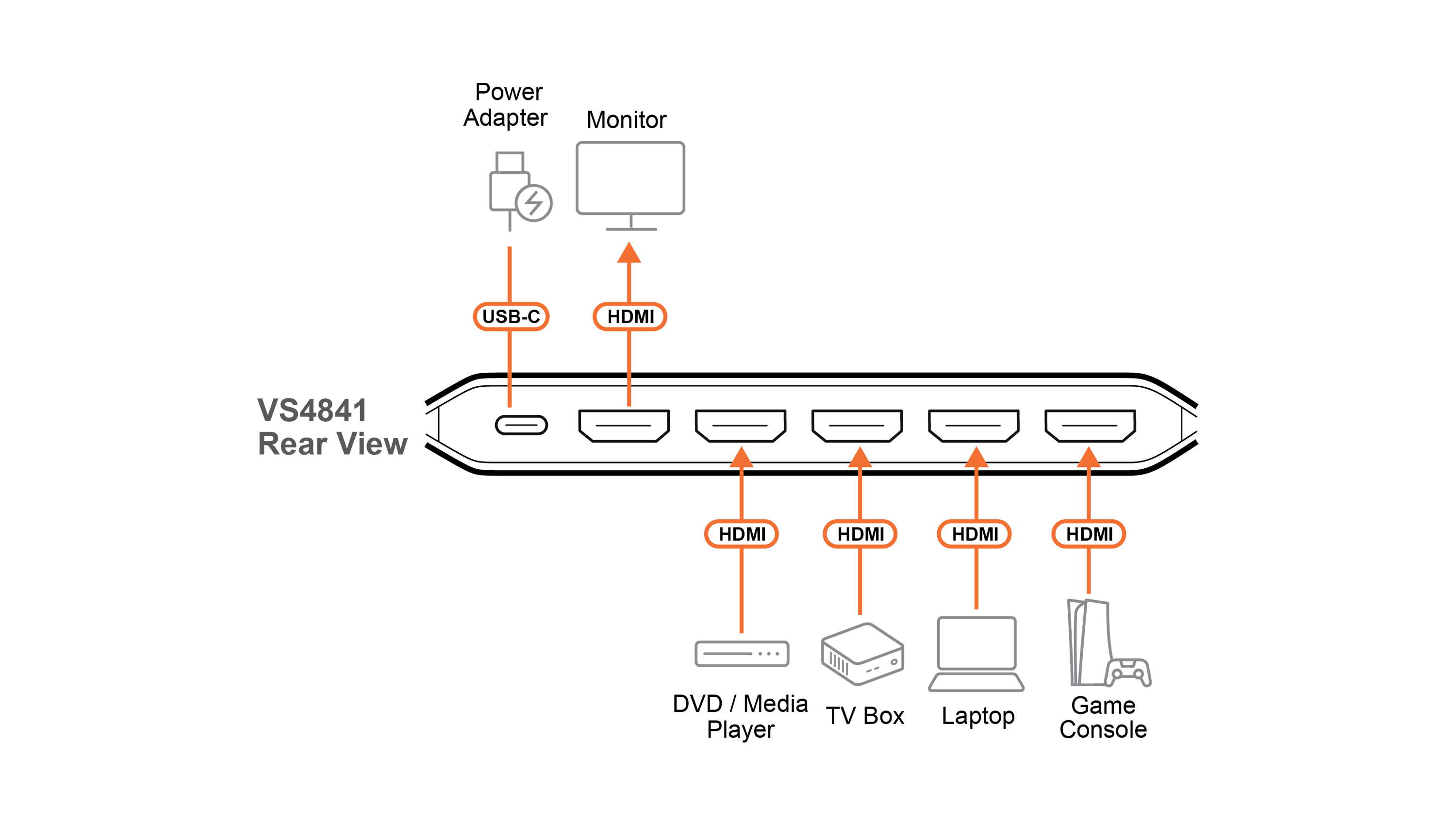Wzbogać swoją domową rozrywkę lub profesjonalną instalację audiowizualną dzięki VS4841 – 4-portowemu przełącznikowi HDMI, który pozwala błyskawicznie przełączać się między czterema źródłami sygnału wideo na jednym ekranie za pomocą jednego naciśnięcia przycisku. Dzięki technologii RapidSync™ przełącznik VS4841 zapewnia oszałamiającą jakość obrazu w rozdzielczości True 4K, eliminuje plątaninę kabli, umożliwia szybkie przełączanie sygnałów AV oraz sprawia, że każde oglądanie jest łatwe i wciągające.
