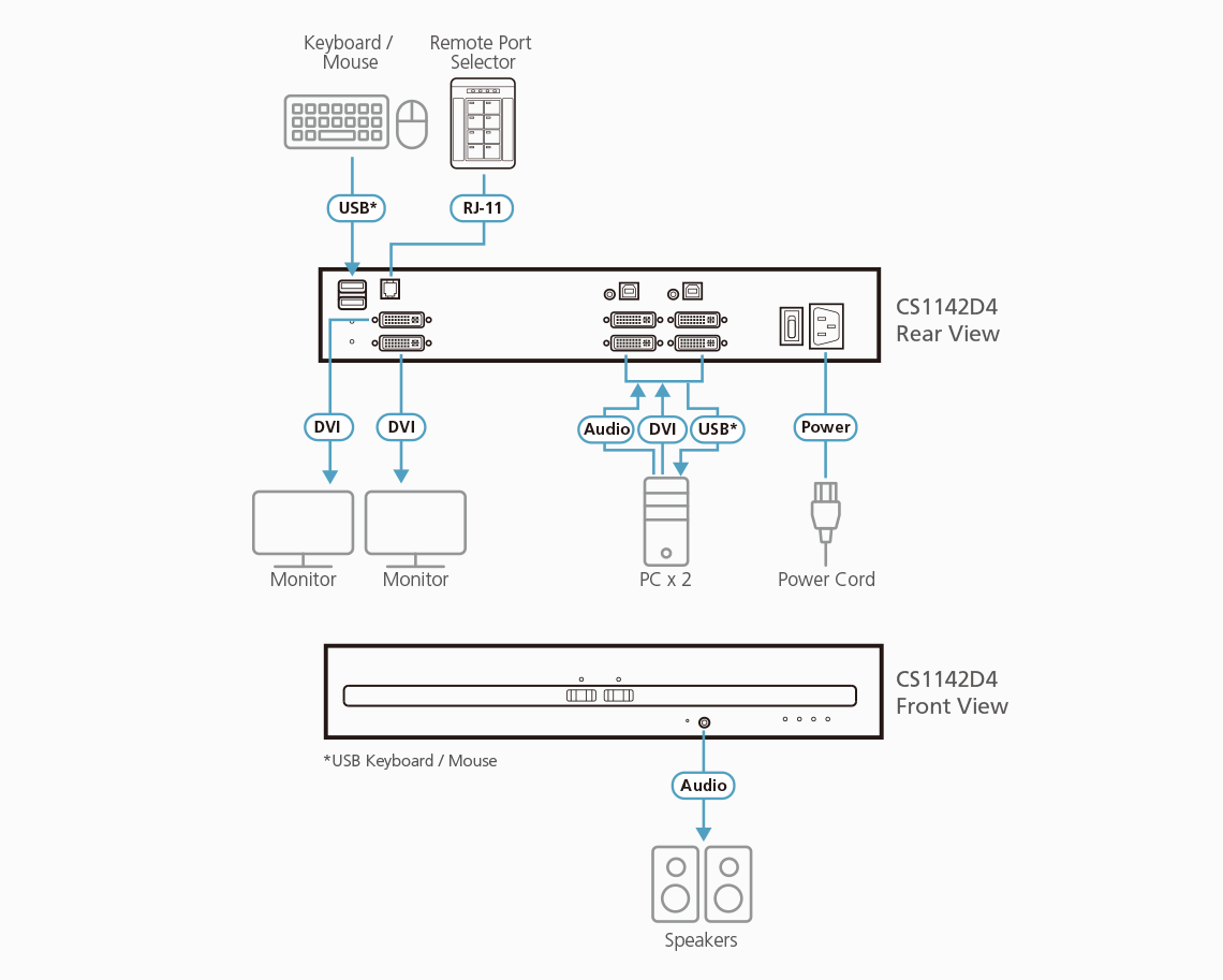 - 1x CS1142D4 - 2-portowy przełącznik Secure KVM USB DVI Dual Display