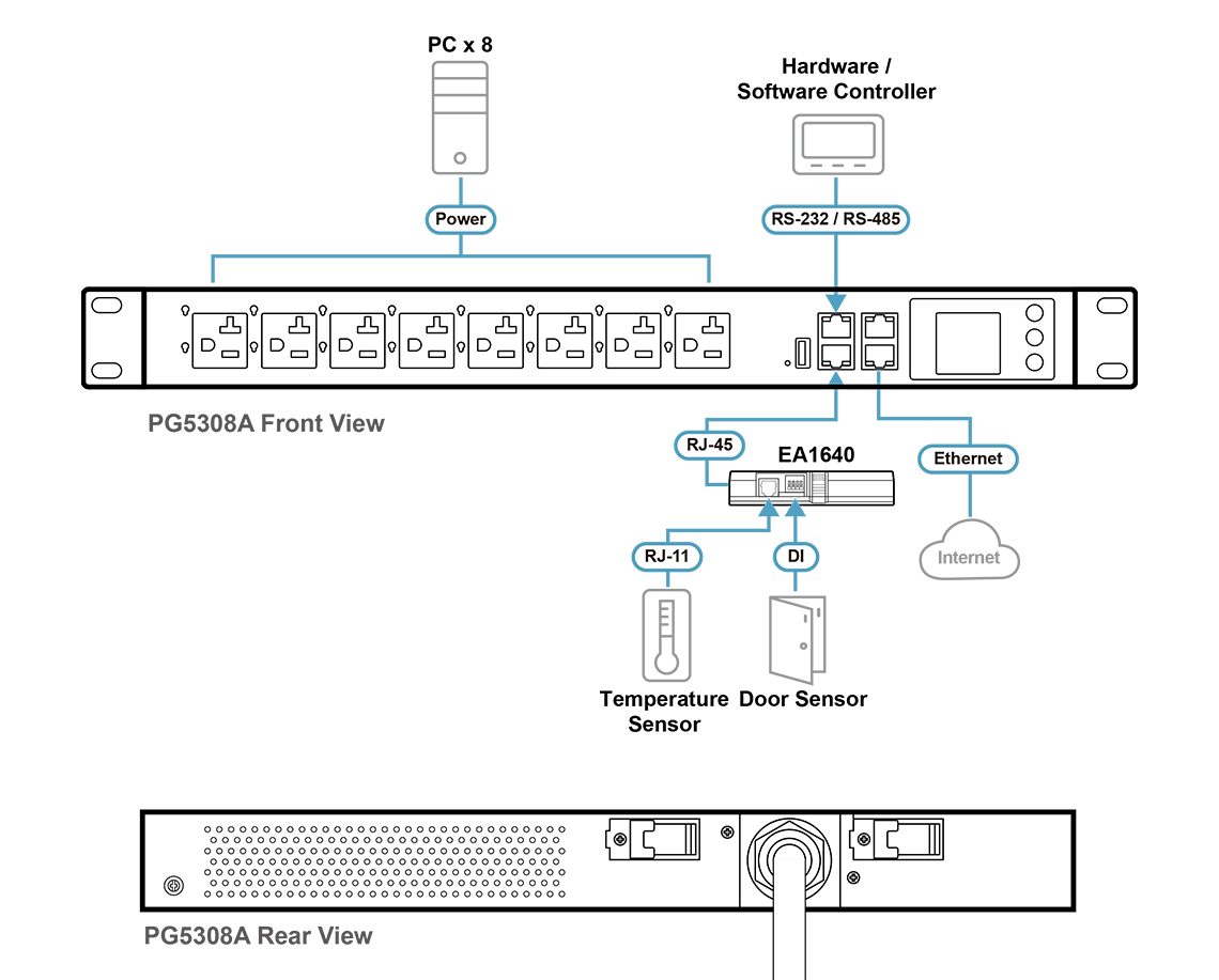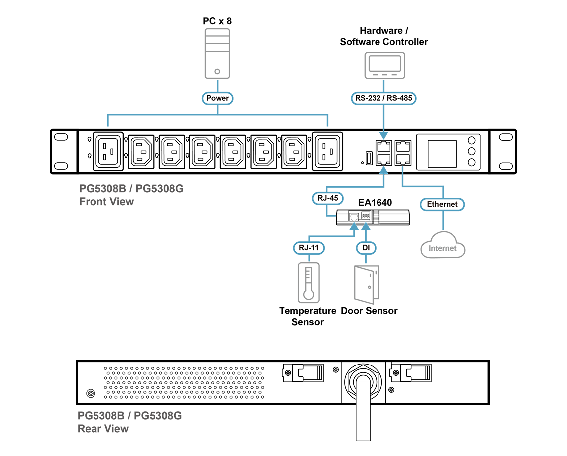 PG serisi PDU'lar, veri merkezi ortamının sağlığını izleyen ve optimum çalışma koşullarını sağlayan EA1640 ile bağlantı kurmak için RJ-45 sensör portlarıyla donatılmıştır. Kullanıcılara sunucular, depolama sistemleri, KVM anahtarları, ağ cihazları ve seri veri cihazları gibi veri merkezi BT ekipmanlarını açma, kapatma veya yeniden başlatma olanağı tanıyan güvenli, merkezi ve akıllı güç yönetimi yetenekleri sunarlar.