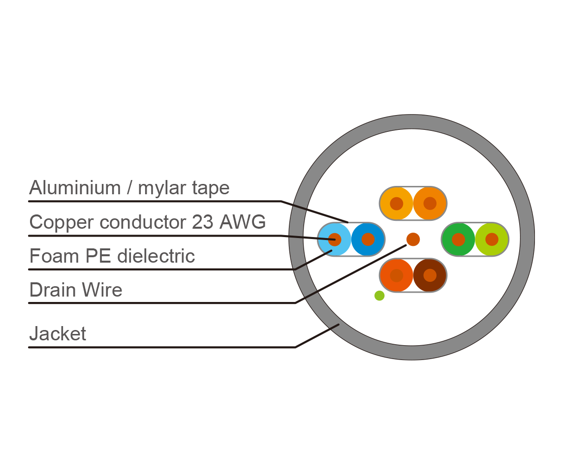 | Renk kodları | Twisted pair color code: Light Blue / Blue Light Orange / Orange Light Green / Green Light Brown / Brown |