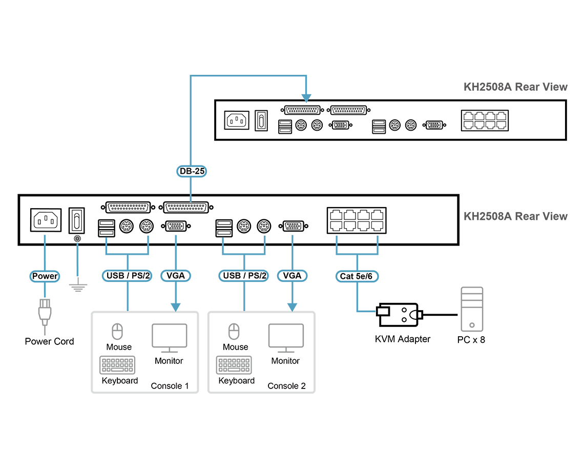KH2508A KVM anahtarı, IT yöneticilerinin iki PS/2 veya USB KVM konsolundan (ikili veriyolu) birden fazla bilgisayara erişip bunları kontrol etmelerini sağlayan bir kontrol ünitesidir. En fazla iki konsolda çalışan operatörler, aynı anda 8 bilgisayara bağımsız olarak erişip bunları kontrol edebilir. Ek 15 anahtarın ardışık bağlanmasıyla, orijinal KVM konsollarından 128 bilgisayara kadar kontrol sağlanabilir.