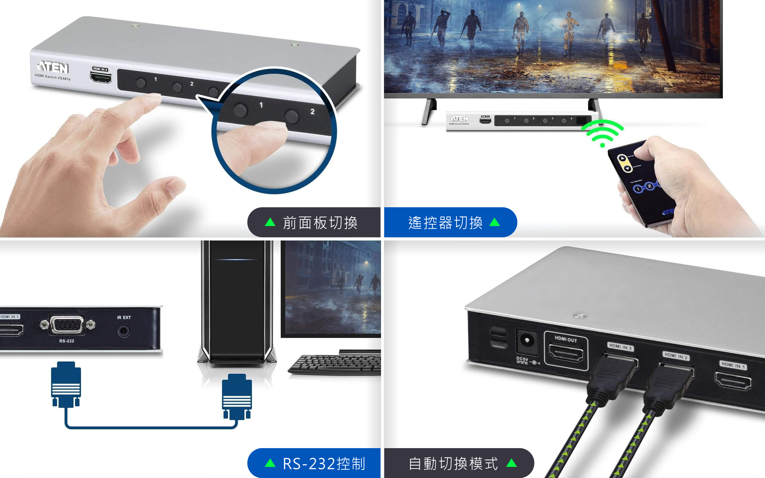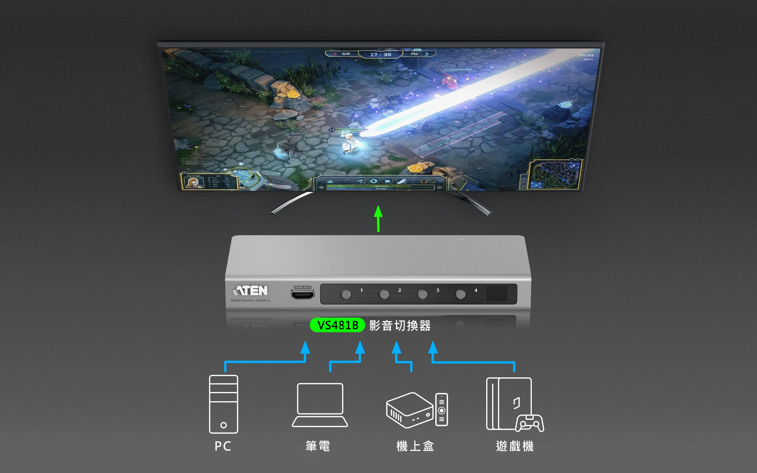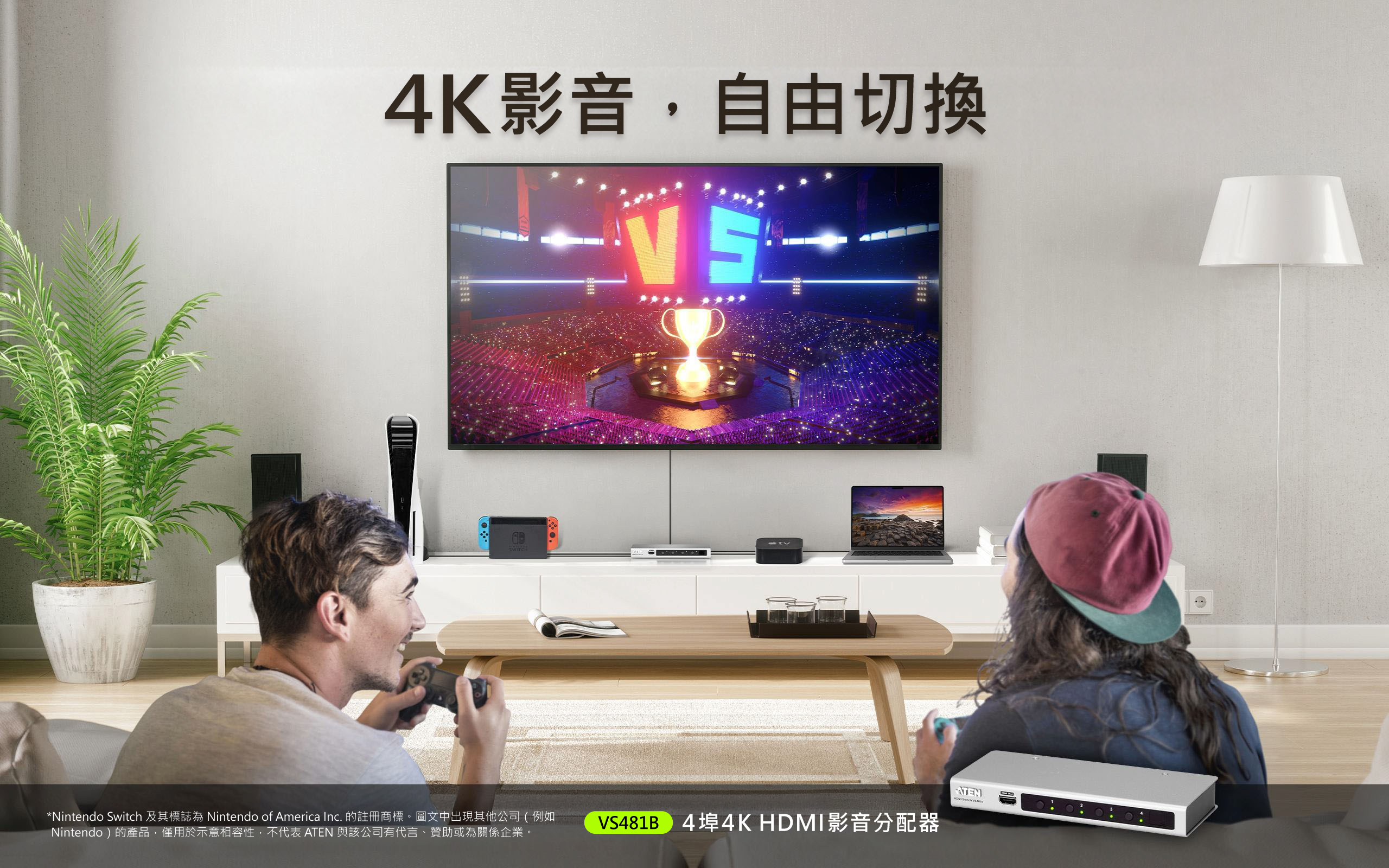 VS481B 為 4 埠 4K HDMI 切換器,提供四組 HDMI 視訊輸入,可將多個影音來源快速切換至一台 HDMI 顯示設備,適合家庭娛樂、會議室與零售展示等情境。