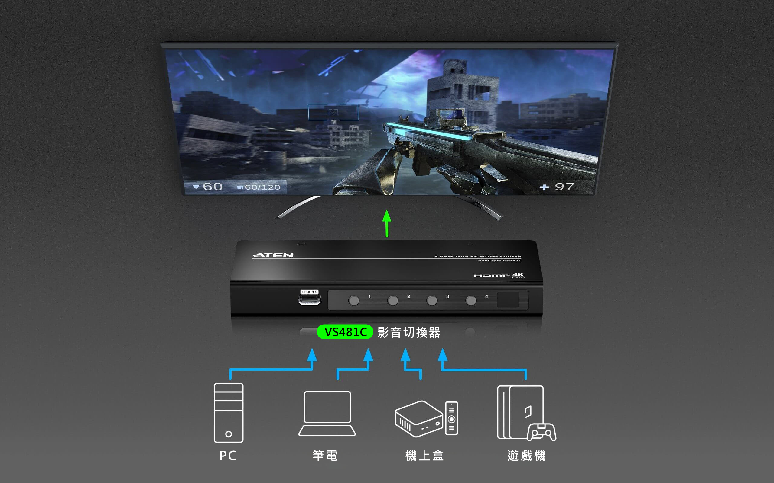 VS481C 為 4 埠 4K HDMI 切換器,提供四組 HDMI 視訊輸入,可將多個影音來源快速切換至一台 HDMI 顯示設備,適合家庭娛樂、會議室與零售展示等情境。