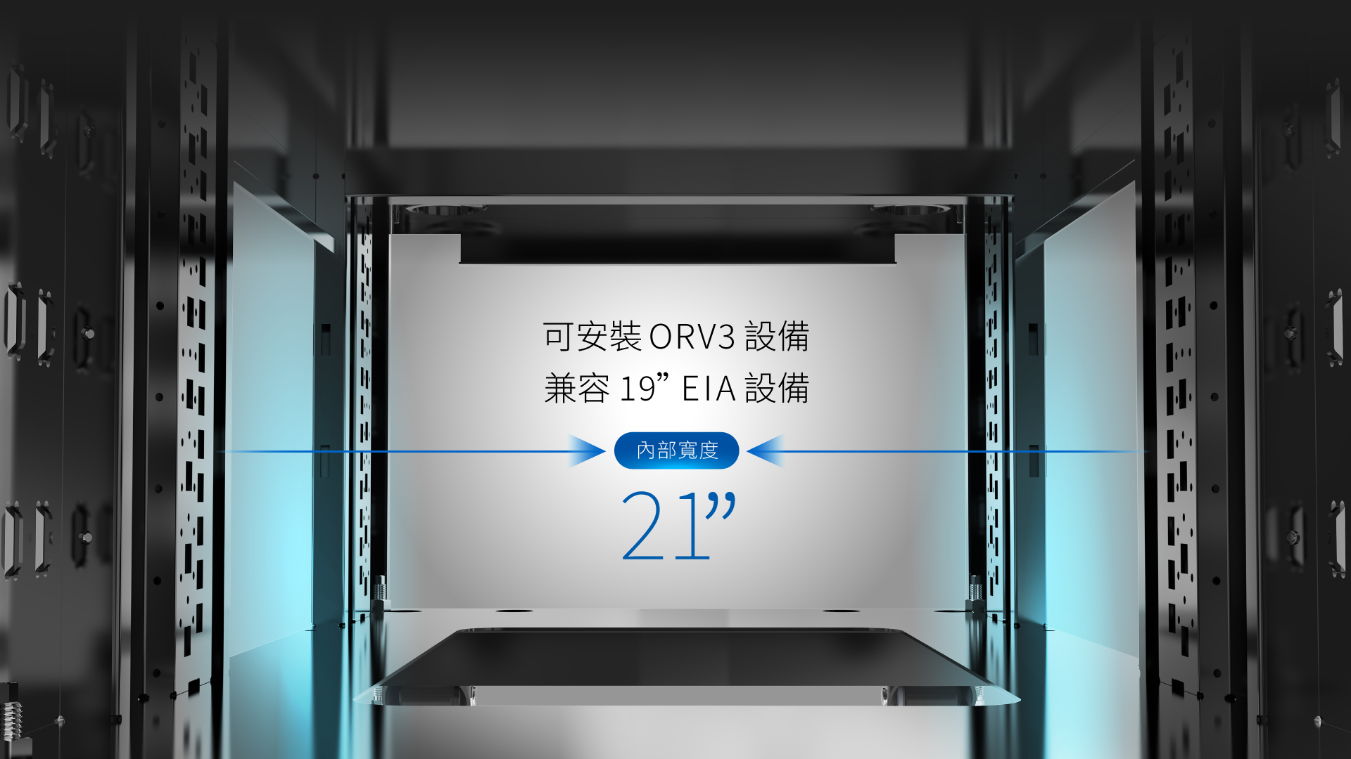 - 機櫃內部寬度21吋,可選購19吋 EIA轉接架,兼容傳統EIA設備