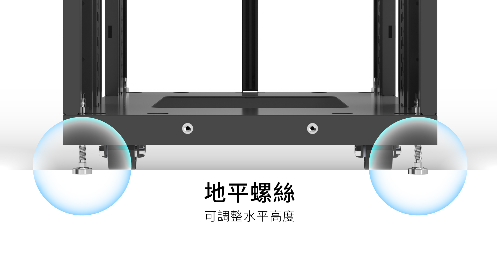 - 機櫃底部配置地平螺絲,可依現場狀況調整高度,確保穩固安裝