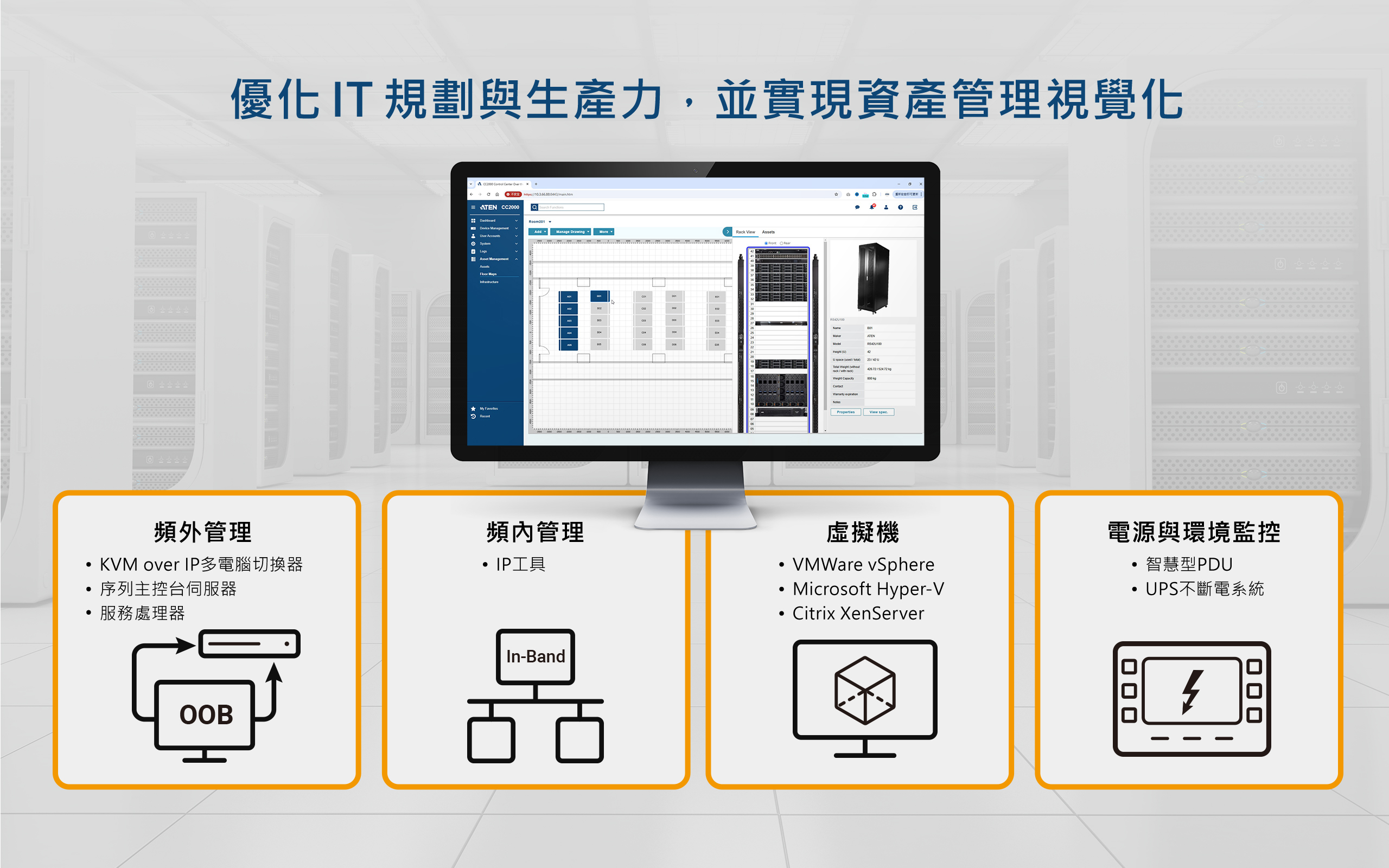 - 資產管理 – 可輕鬆查看資料中心內每個資產的規格、外觀、位置和配置,使用者能夠提高資料中心運行的效率和可靠性