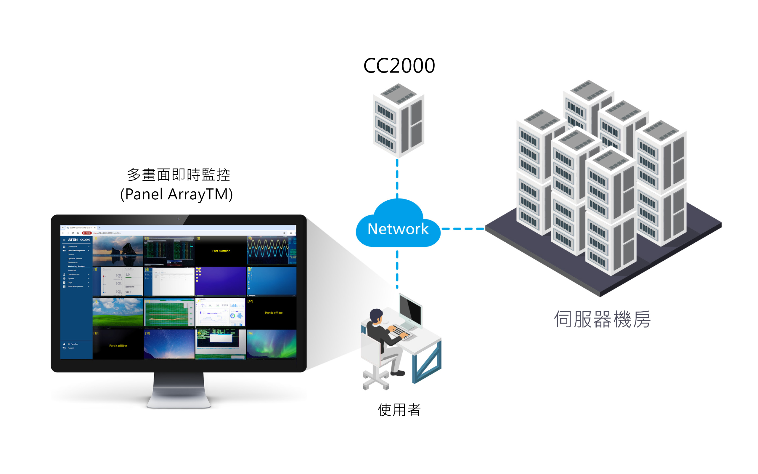 CC2000管理軟體,是ATEN專為各產業之IT管理團隊所設計的全方位集中式管理解決方案。透過登入單一入口,管理者即可於本地端或遠端管理IT基礎設施。CC2000同時具備頻內及頻外存取功能,方便使用者管理網路架構內所有的IT 設備,包括ATEN 的KVM over IP 多電腦切換器、序列控制端伺服器、PDU電源分配器、UPS不斷電系統、以及其他第三方設備,例如嵌入式服務處理器(embedded Service Processor)、刀鋒伺服器、服務處理器、與虛擬伺服器。全新改版的CC2000支援HTML5使用者介面,打造了更流暢、直覺易用的操作體驗,大幅提升管理效率。