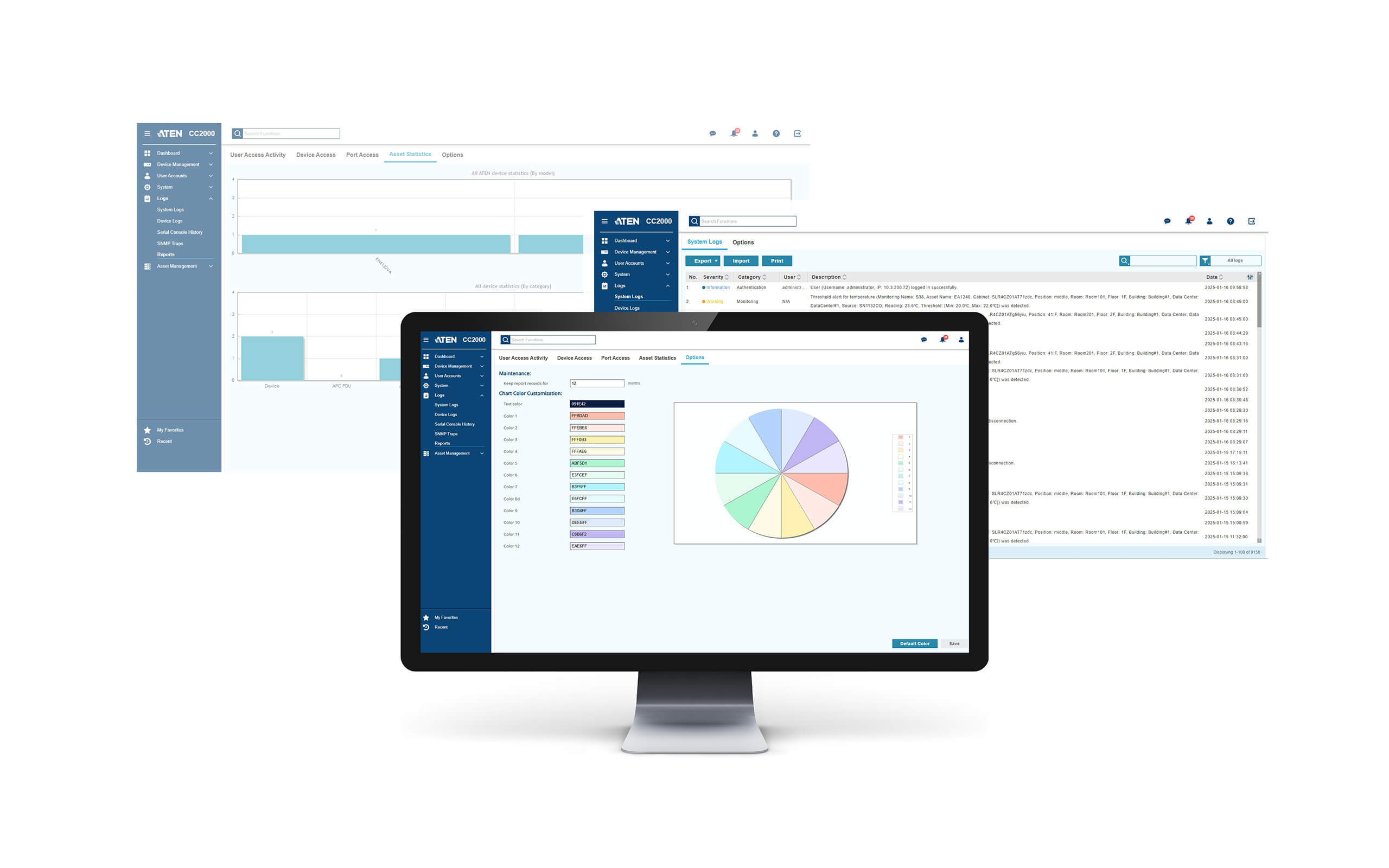 除了系統日誌外,CC2000 亦整合 ATEN KVM over IP 多電腦切換器、序列主控台伺服器、PDU以及網路設備(例如路由器、NAS、交換器– 透過 SNMP 通訊協定)的所有日誌,方便安全性除錯,並可透過 syslog 協定提供稽核追蹤紀錄。此外,系統亦能產出使用者存取、設備存取、連接埠存取和資產統計等活動報告,以利後續分析與管理。