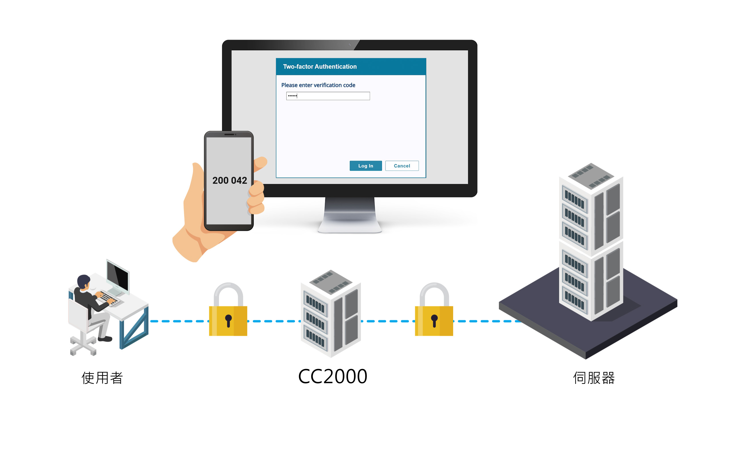 CC2000 可集中管理使用者登入憑證,支援多種外部驗證協定,包括 Windows AD、LDAP、Kerberos、RADIUS 及 TACACS+。此外,使用者帳號管理具備高度彈性,可依需求設定角色型存取控制 (Role-based access control),例如:超級管理員、管理員、資產管理員、一般使用者、稽核者、Dashboard 檢視者等。