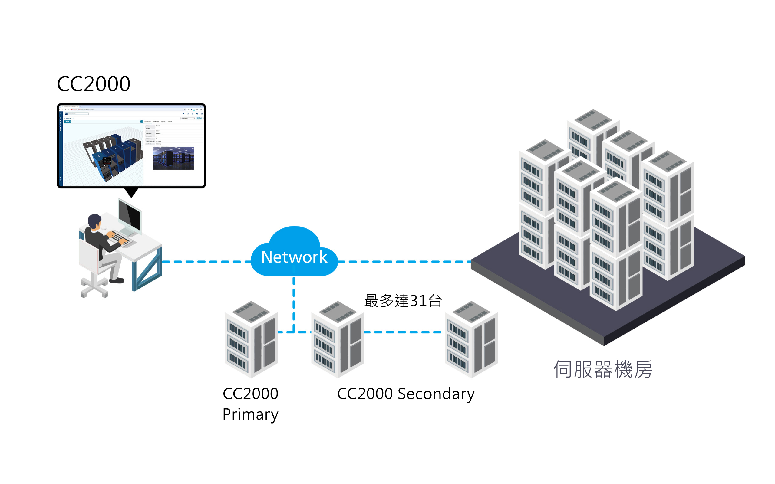 CC2000 支援主從式網路架構,可部署最多達 31 部備援伺服器,實現服務備援機制。系統會定期同步主伺服器與備援伺服器之間的設定資料,以確保最佳的系統可用性,同時將突發停機所造成的影響降到最低。