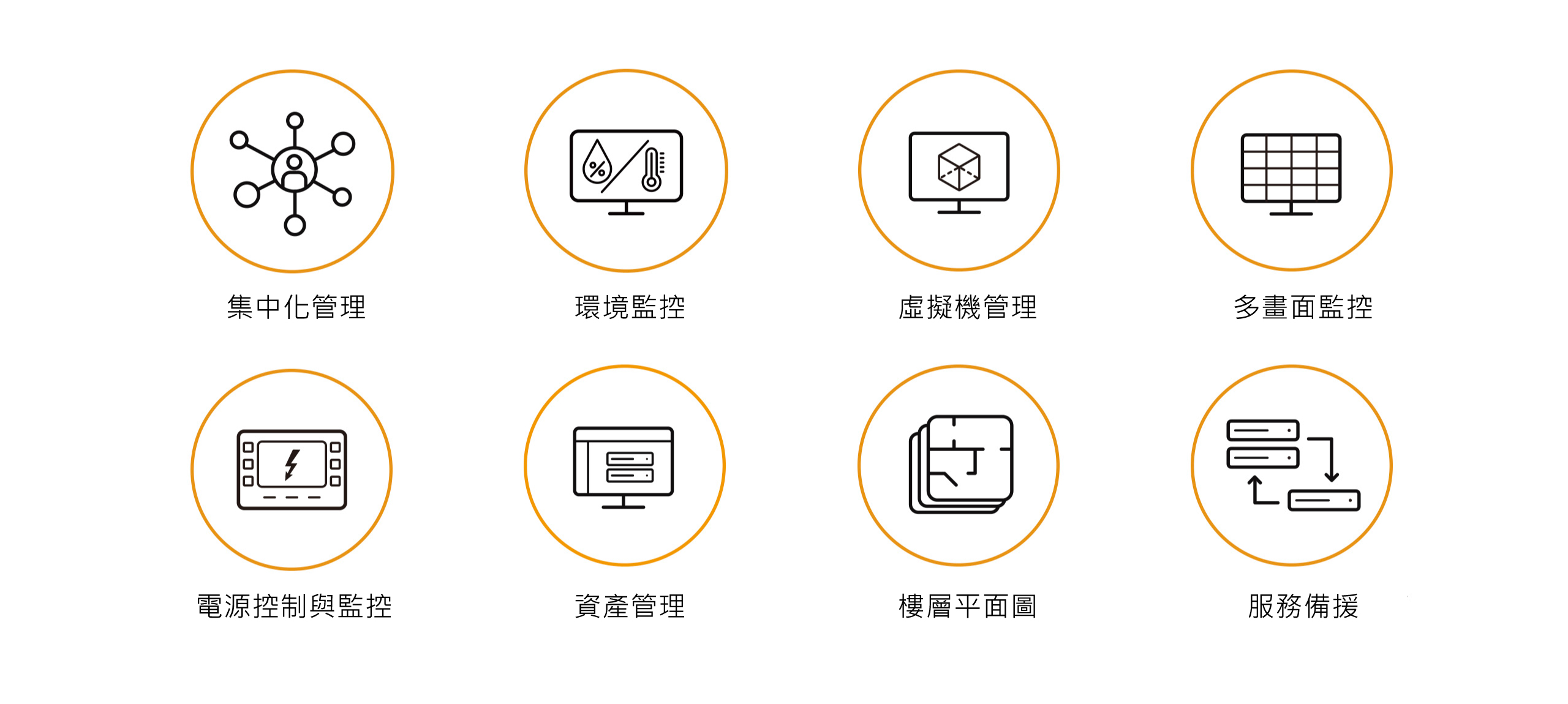 - 環境及電源控管 – 監控伺服器機房和資料中心的溫度、濕度、氣壓、電壓、電流、功耗、漏水和門禁