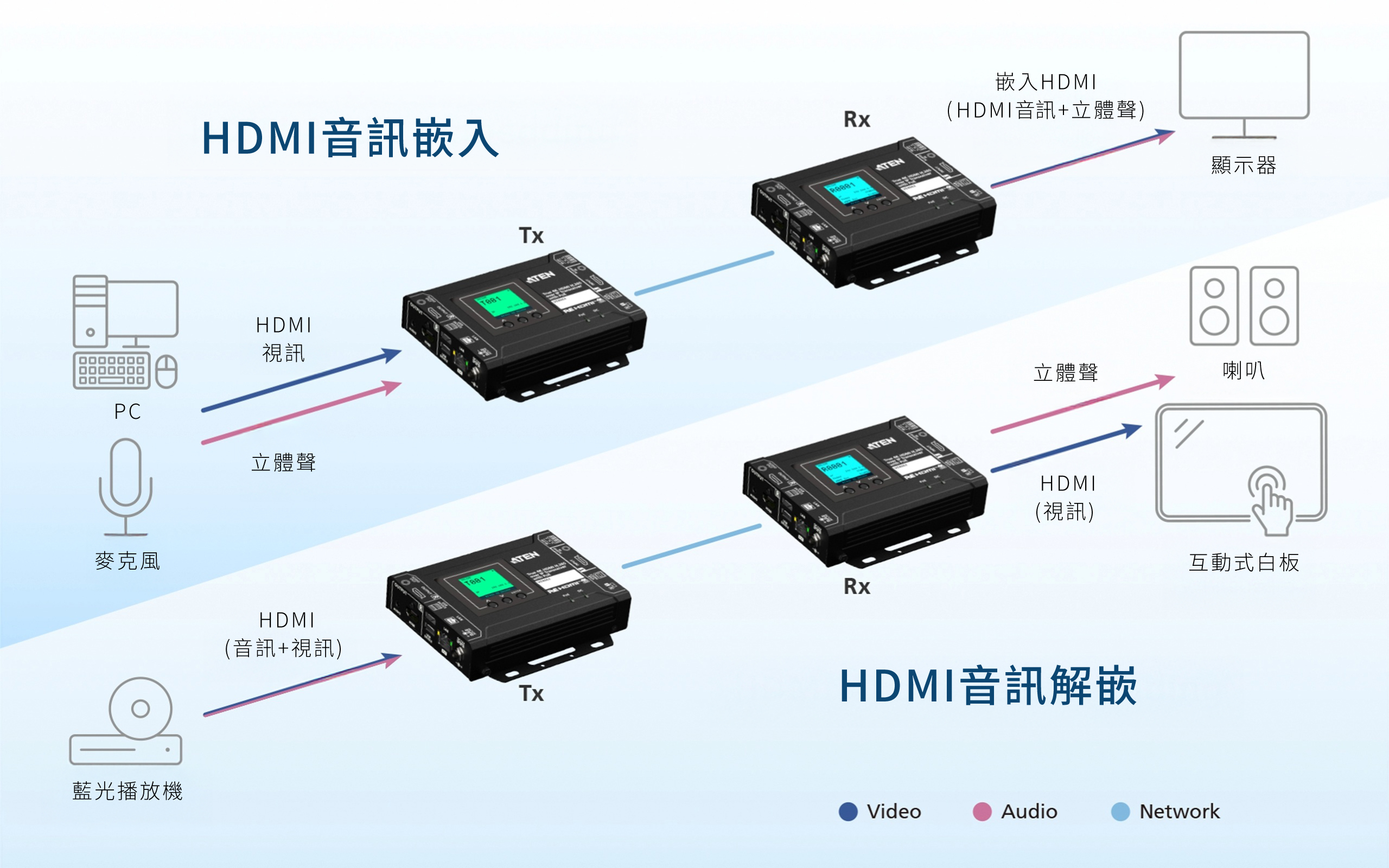 - 傳送器 – 可將各別立體聲音訊嵌入至HDMI 串流
