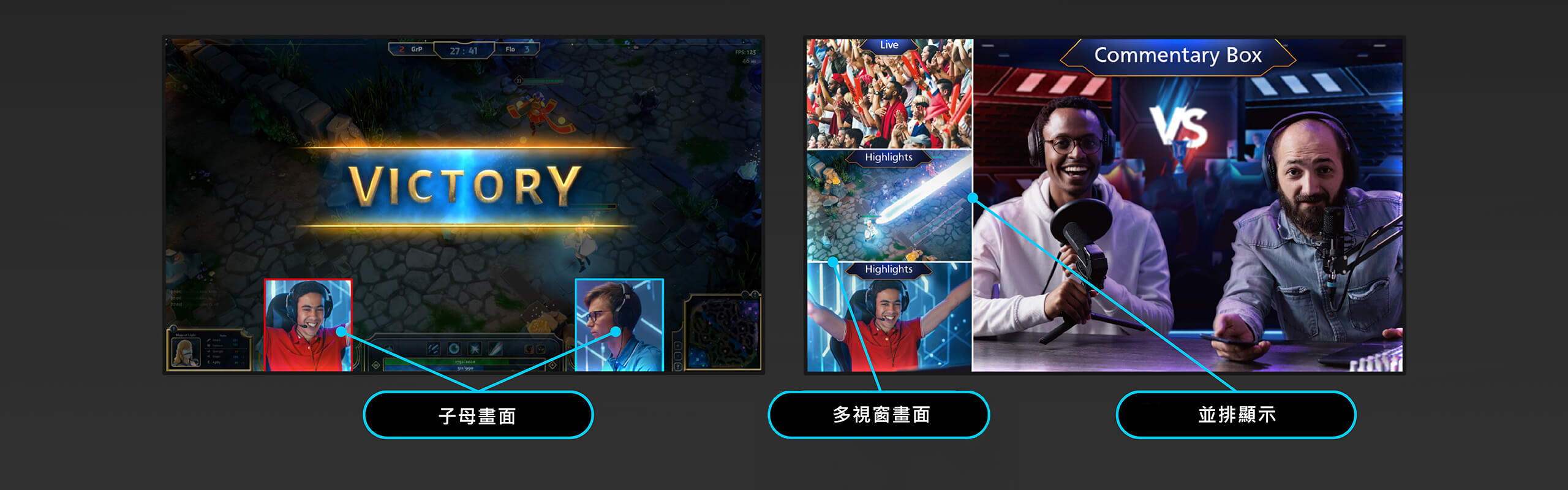 - 先進的電視牆引擎 – 支援裁切、重疊顯示、左右並列、子母畫面、邊框補償等畫面配置