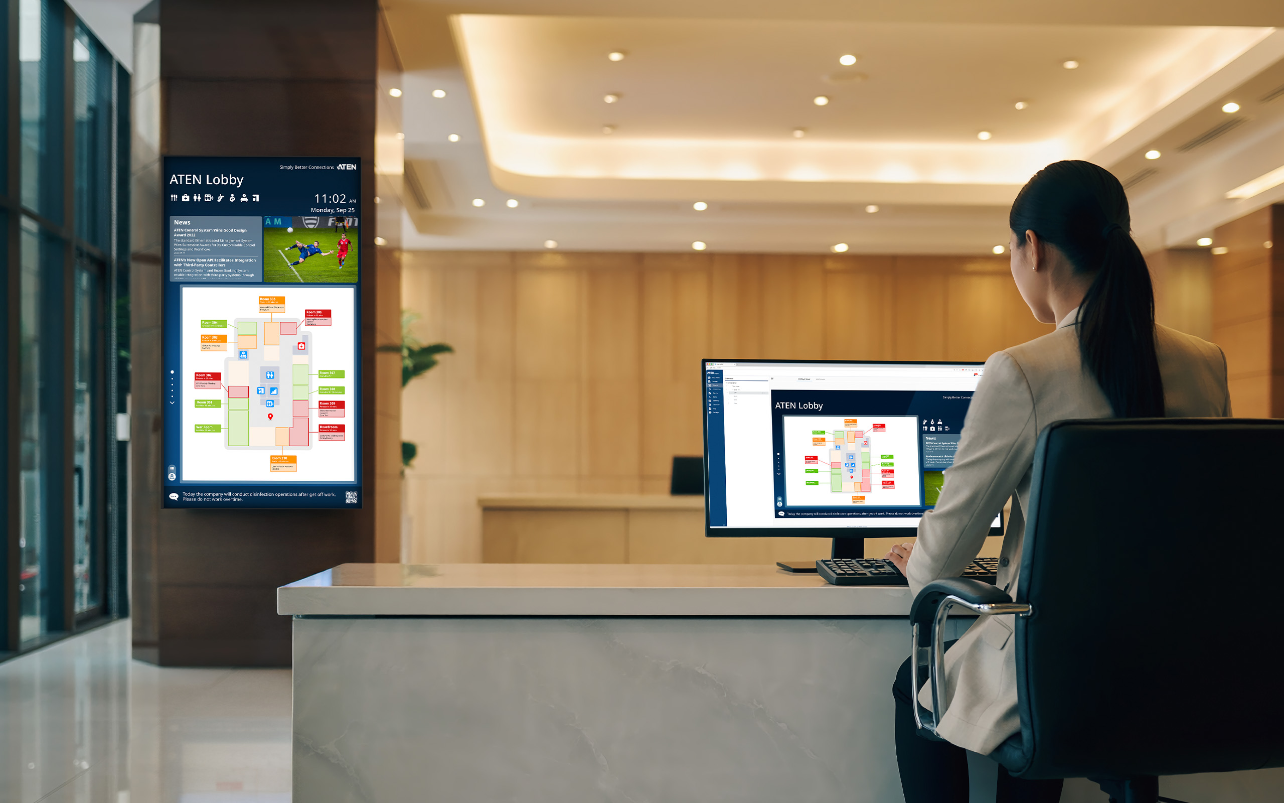 By integrating with ATEN Unizon – a powerful global AV management platform that provides centralized control and real-time monitoring of device connections, room availability, and space utilization – administrators, particularly front-desk staff, are empowered to efficiently oversee all rooms and spaces through their respective infoPlayer Viewers in Unizon, ensuring effective management and timely operations.