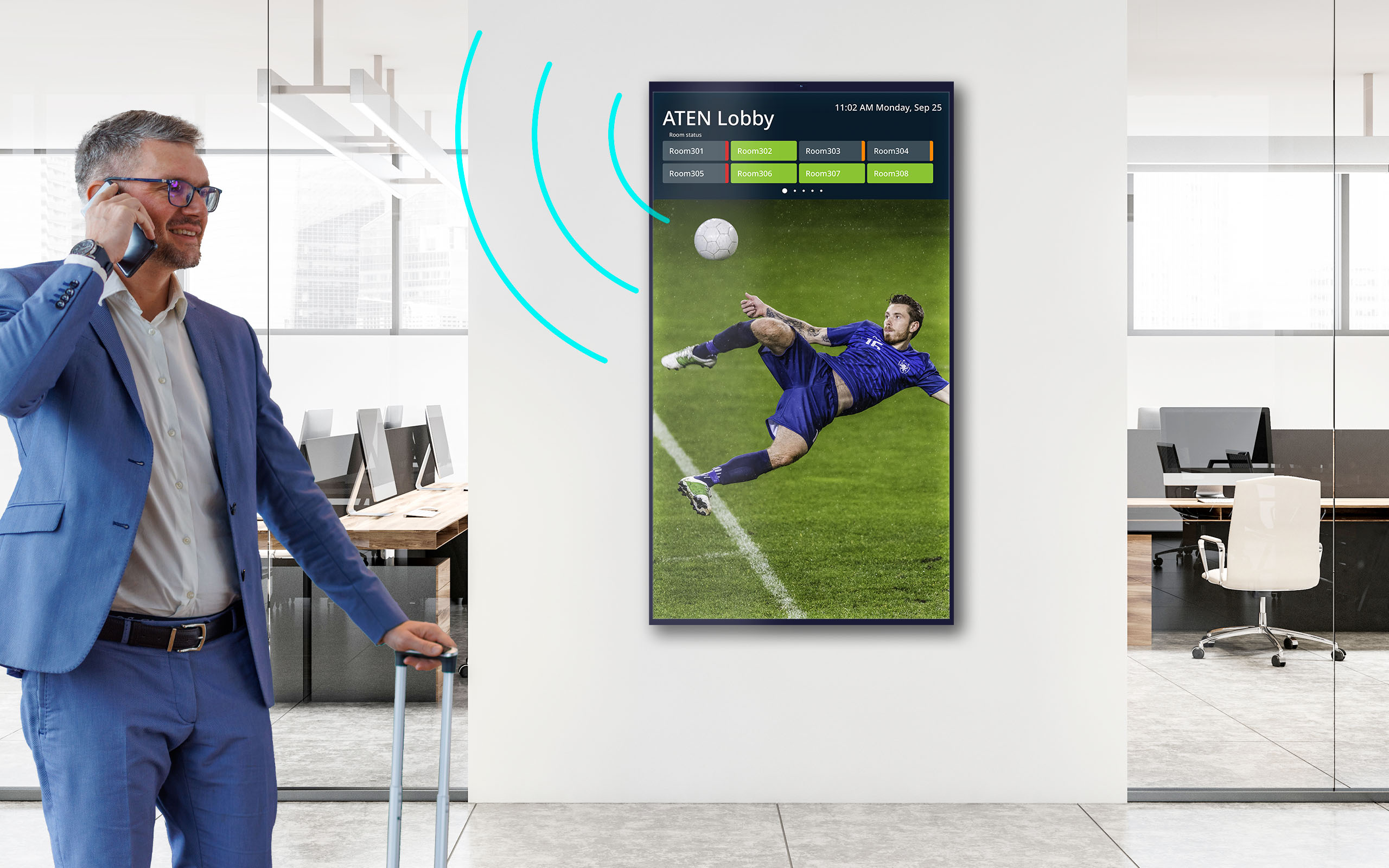 As a new addition to ATEN Room Booking System (RBS) portfolio, the VR610 RBS infoPlayer works with RBS Configurator the centralized configuration tool and the RBS panels to show real-time meeting room occupation status and the organization’s important news/announcements in an overview. Room availability can be presented in List View, which displays reservation details in an easy-to-read list format, or in Map View, which visualizes the location of each room to help users navigate through the spaces quickly. Connecting the VR610 to the PIR sensor included in the packaging enables human presence detection so the multimedia content on-screen will be enlarged for better visibility for those passing by.